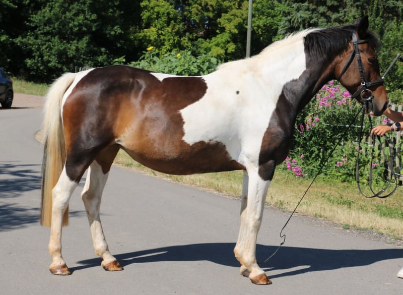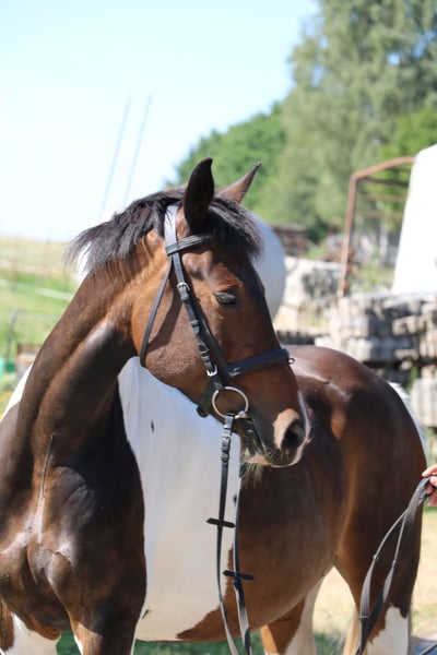 For sale is this 2011-born pinto mare, suitable as a family horse, for leisure riding, breeding, or moderate sport use. She is also of interest for breeding, having produced two offspring so far, both of which have won up to Jumping Horse A with scores of 8. Gentle enough for children to ride and handle. Due to health issues (developing vertebral problems in the back), she is being offered at a significantly reduced price. Farrier and loading friendly. Herd compatible.