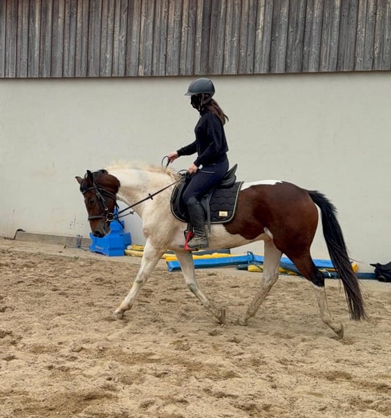 Zum Verkauf steht ein 4 Jahre alter, etwa 154cm großer Pinto Wallach mit Abstammung vom ZSSE. Er ist freizeitmäßig in allen Gangarten im Gelände und auf dem Reitplatz geritten und zeigt sich mit Reiter absolut brav und gelehrig. Er war auch schon alleine im Gelände und íst eher der coole Typ. Auch im Umgang ist er brav, manchmal noch etwas verspielt. In der Herde zeigt er sich verträglich und kann auch robust gehalten werden. Er wäre auch sehr gut als Westernpferd geeignet, da er die Ausrüstung und Hilfen kennt. Er befand sich zum Anreiten in professionellem Westernberitt. Krankheiten oder Allergien sind nicht bekannt. Eine AKU darf gerne gemacht werden. Für das Probereiten, Vorreiten oder anderes Ausprobieren des Pferdes berechnen wir 35€. Beim Kauf wird dies gutgeschrieben. Gerne anrufen oder eine Nachricht senden 0157 36803742 Alle Angaben ohne Gewähr, Preisänderungen vorbehalten, Transport möglich, Onlinekauf möglich