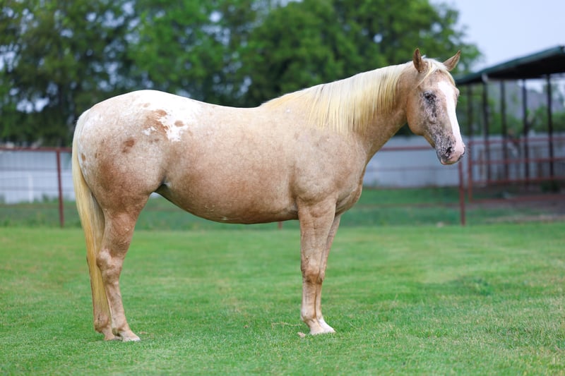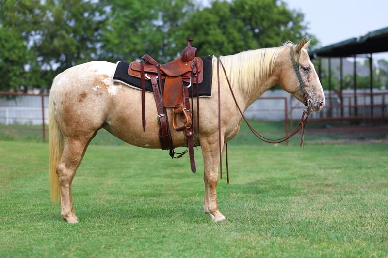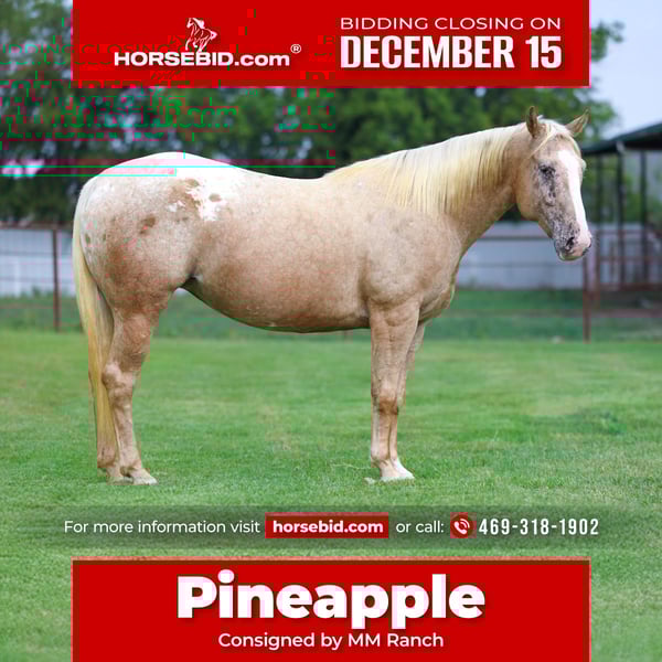 🎄𝐓𝐇𝐄 𝑯𝒐𝒍𝒊𝒅𝒂𝒚 𝐂𝐋𝐀𝐒𝐒𝐈𝐂🎄 Happening now thru MONDAY | DECEMBER 15th - Available EXCLUSIVELY on HorseBid's website! For more details and to register visit: www.Horsebid.com CONSIGNOR CONTACT: MM Ranch 469-318-1902 LOCATION: Forney, TX BREED: POA REGISTERED: No COLOR: Palomino Appaloosa HEIGHT: 14 AGE: 6 GENDER: Mare WOW!!! 🍍Pineapple🍍is a stunning POA blanket palomino Appaloosa mare!! When was the last time you seen one like her?! She is a one of kind for sure!! Best part is she only 6 yrs old. So she has her whole life ahead of her. Plus is the perfect size for both kids and adults. She stands a perfect 14 hands tall. She is a wide thick girl. Pineapple would absolutely be a great first performance or trail horse for a youth or beginner wanting to enjoy a good safe horse. You can do the amateur jumping or transition into the ranch riding. Or just enjoy her as a safe family horse. She is truly an all around girl and has done a little bit of everything. And she is 100% safe!!! She is easily maintained at home, does not require a program, stalling or any high maintenance. Pineapple has been used in a lesson program as well to teach beginner children how to lope as she is easy to maneuver, and transition into her slow, smooth and easy lope! She is beyond forgiving and easy to get along with! She will also leave the arena and go trail ride, cross water, bridges and more! We even rode her through traffic and in town! Pineapple has also been exposed to cattle, so helping gather on the ranch is just another thing you can enjoy doing with her! She truly is an all around girl. And did I mention she is absolutely safe and fun to ride. In the arena and on the cross country course she has all the buttons, preforms them effortlessly and is beyond forgiving! She is a perfect mover, has beautiful transitions, effortless lead changes, controllable spins, and so much more! All you have to do is point and kick. She will do whatever you ask of her. She will side pass to work a gate, goes over tarps, obstacles, water courses, etc. She will easily transition into the ranch riding as well. She would be great for a kid looking for a new best friend to join 4H with, or a beginner to start their show career. At the barn, Pineapple is easy and simple! She has absolutely no weave, crib, bite, bolt, kick or rear. She is easy bathe, tack, and groom. She jumped right onto the trailer and backs off! She is great being stalled but really does enjoy her turn out and will be the first to greet you at the gate! She does not care about other horses and will go out by herself, in a group of geldings or mares with no problems. 🍍Pineapple🍍is ready to go and is fully UTD on everything. We can help arrange shipping absolutely anywhere! Feel free to reach out with any questions.