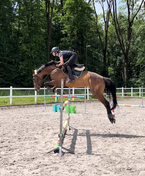 For sale: 9-year-old beautiful mare. Experienced horse, in regular professional training, catches the eye, pleasant to ride, carries softly. Mare with very good jumping technique, fast, agile, and precise in the show jumping arena, expressive movement. Healthy, not injured, in one hand for over 5 years, where she was ridden by a petite girl and teenagers at the silver level. Well-behaved in handling, with the farrier, veterinarian, all grooming procedures, and during transport. Horse only for experienced ambitious riders who enjoy horses with a spark ;) A vet check was done at the time of purchase over 5 years ago - exemplary. Only to loving private hands ❤️ Due to her sporting pedigree, she is also suitable for breeding. Horse available for viewing in Inwałd - Małopolskie Voivodeship.
