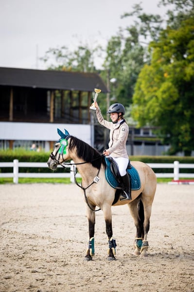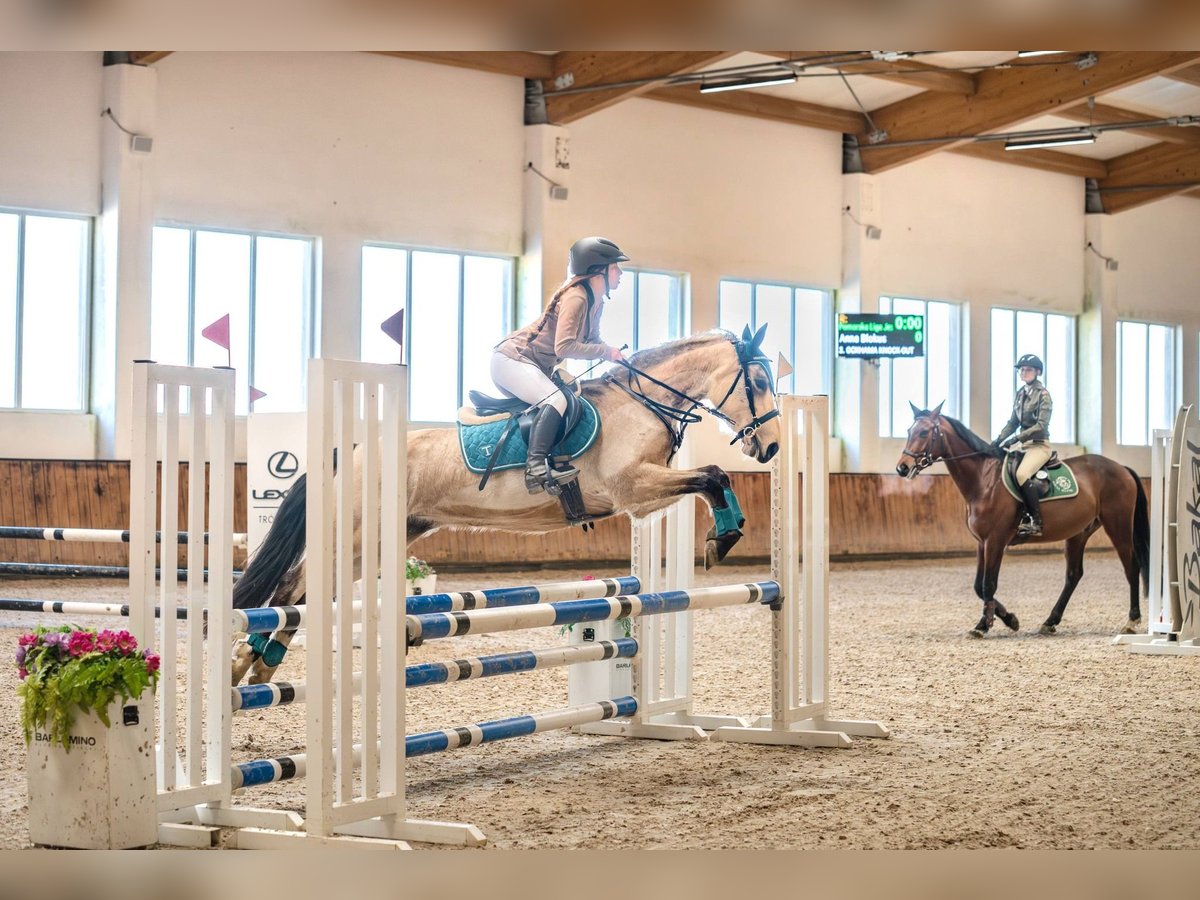 Zu verkaufen ist eine sehr talentierte Stute der Größe G (145 cm). Sie ist brav, scheut kein Wasser und ist bei Pflege- und Transportmaßnahmen unkompliziert. Im Gelände ist sie brav. Sie springt sogar auf dem Cordeo Parcours. Trotz ihres jungen Alters hat das Pony bereits zahlreiche erfolgreiche Turnierstarts bis 90 cm absolviert. Sie hat sogar die polnische Meisterschaft im Vielseitigkeitsreiten gewonnen. Zu Hause springt sie bis 120 cm an einzelnen Hindernissen. Sie ist leicht im Parcours, hilft viel (rettet). Auch im Dressurbereich ist sie sehr gut ausgebildet. Sie beherrscht fliegende Wechsel, Seitengänge, Schulterherein und Zügellängswechsel. Für ein gut reitendes Kind geeignet. Sie ist ruhig, hat aber einen eher dominanten Charakter (testet den Reiter, buckelt), daher ist eine konsequente Führung notwendig. Die Stute ist aktuell gesund, hatte aber im letzten Jahr Magengeschwüre, die vollständig geheilt wurden (Gastroskopie-Film zur Einsicht). Sie hatte nie eine Verletzung. Die letzten beiden Bilder zeigen ihre Mutter und ihren Vater. Verkauf erfolgt aus finanziellen Gründen. Für entschlossene Käufer besteht Verhandlungsbereitschaft. Videos: Freies Springen: https://youtube.com/shorts/ZNcLe1Zw_i8?feature=share 90 cm Barłomino: https://www.facebook.com/reel/918005070858011 Hipodrom Sopot (offen) Springen: https://youtube.com/shorts/BEyHe6mdtuk Hipodrom Sopot (indoor) Springen: https://youtube.com/shorts/K28ZqxQYDH0 Barłomino (offen) Springen: https://youtube.com/shorts/9fqZlqD8u5s Barłomino (indoor) Springen: https://youtube.com/shorts/sdjEkgTgGRQ Vielseitigkeitsreiten Dressur: https://youtu.be/uzD_aMLI5NI Standort: Reithalle Baskil in Karczemki (bei Chwaszczyno)