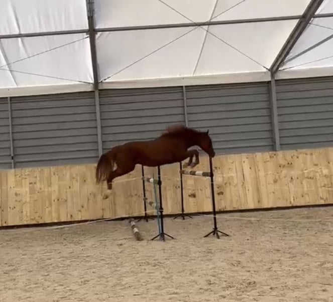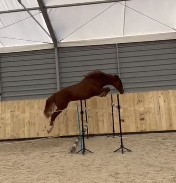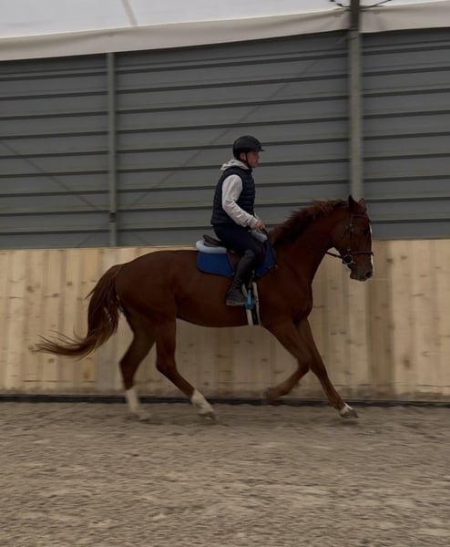 Four-and-a-half-year-old chestnut gelding approximately 168 cm tall, primarily of Holstein origin; sired by Cassilio out of the mare Lanvester L. He moves in three gaits with a rider and has been lightly backed under saddle. In the arena, he demonstrates excellent jumping ability. Test rides are possible. Please contact me only by phone; videos can be sent via WhatsApp.