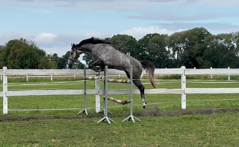 Lovely young gelding from top bloodlines seeking a new, good home. Tall, correctly built with perfect legs and good hooves. Very good movement in all three gaits. Erdon is a very nice and easy-to-handle horse with a calm and friendly temperament. His world-class pedigree makes him an outstanding prospect for top-level sport. He has enormous potential and a perfect jumping style. At least 10 of his siblings compete at 1.60 m level, 5 at 1.50 m, and 33 at 1.40/1.45 m. He grew up in large meadows with a group of other young horses, allowing him to mature and develop healthily. Friendly towards other horses. Ridden daily on spacious paddocks. Currently approximately 173/174 cm, with a final height of about 175+ cm expected. He has just begun his training. So far, he is familiar with the saddle and rider, but has had limited training due to his owner’s lack of time. Therefore, the price reflects his current level and quality! The price will increase as his training progresses. The horse is 100% healthy, with no vices or undesirable behaviors. Recently had clear X-rays (07/2025). Vaccinated and dewormed up to date. Located 50 km from the Polish/German border. Videos and more information via WhatsApp at +48 513 179 245. Transport can be arranged.