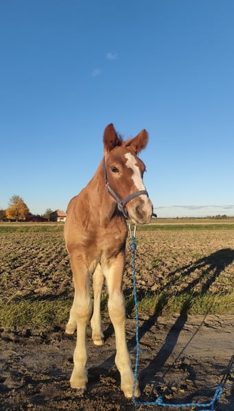 Geboren op 5 september 2025. Moeder: W-Lalka/Tajfun (de laatste twee foto's), vader: Poseidon/Lukas. Rustig van aard, geeft de benen, na het eerste hoefsmidbezoek loopt hij aan de longe, wordt hij aan de halster gewend, wordt hij vastgebonden en wennen aan aanrakingen over het hele lichaam (is wat wantrouwig). Hij leert heel snel. Ontwormd. Mogelijkheid tot castratie tegen meerprijs na het zogen. Ophaalbaar in maart, na het behalen van 6 maanden. In de toekomst geschikt voor recreatie, als gezelschapspaard, voor de koets of fotosessies – de moeder heeft een lange, dikke manen, dus er is een grote kans dat hij dat heeft geërfd. Ik vind het belangrijk dat het veulentje in goede handen komt, hij is niet voor de vleesproductie. Vanaf de geboorte dag en nacht op de wei met leeftijdsgenootjes.