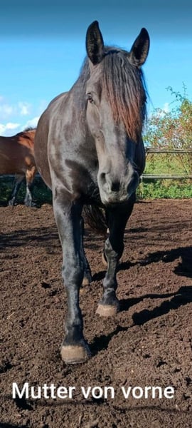 Ein neues Zuhause sucht unser Überraschungsfohlen Noel - der an Weihnachten geborene. Er wurde Weihnachten 2022 (24.Dezemeber) geboren und ist somit aktuell 2 3/4 Jahre alt und bereits Wallach. Leider hat uns seine Mutter, eine charakterlich wunderbare polnische Kaltblutstute, nicht verraten wer sein Vater ist. Aufgrund seine aussehens und seiner erhabenen Oberlinie könnten wir uns vorstellen das es ein Friese oder ähnlich elegantes Pferd gewesen sein könnte. Seine Mutter hat ein Stockmaß von etwa 1,70m, er misst aktuell etwa 1,62m. Den Sommer hat er mit drei weiteren Wallachen auf der Koppel verbracht, wurde im letzten Winter aber schon ein paarmal am Kappzaum longiert.