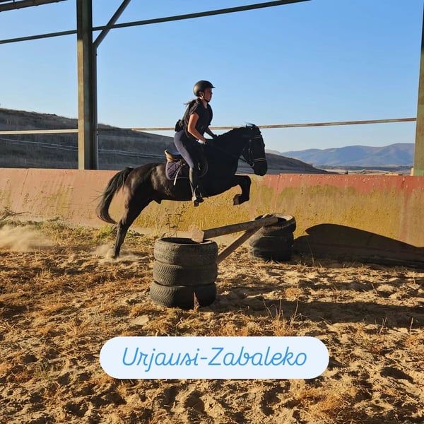 Pottoka con futuro prometedor para salto o completo. Muy fácil para salto. Super buen carácter y muy cariñoso. Carga y descarga perfectamente en el van. Muy sociable con personas/niños, otros caballos y perros. Trabaja solo o en grupo perfectamente. Para iniciar en competición en 2026. Visítanos en Instagram @pottokak.agurain