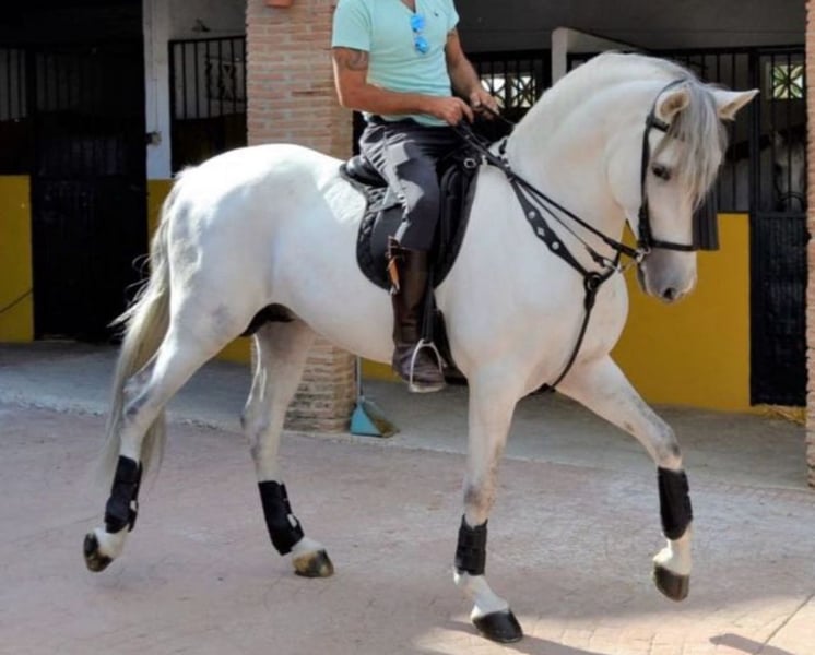 For sale is Yucateco, a snow-white PRE stallion from the old lines! The baroque Schönlig comes with a top pedigree with lots of blood from the old lines! Well-known names such as the top sires Armas Tortugo, Faraon and Lego are just some of them. Yucateco is ridden at elementary level, masters the lateral movements and starts with the piaffe! He has a very reliable character, knows ferias and is always reliable under saddle. This Spanish beauty comes from the very best stock, with full PRE papers and a current purchase examination with x-rays! Location: Spain - transport can be organised worldwide!