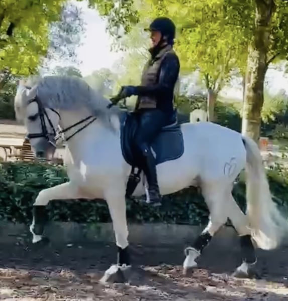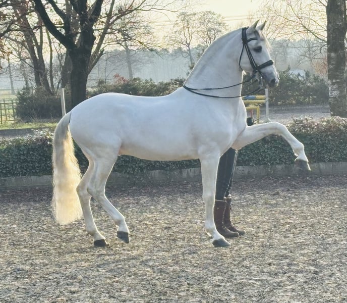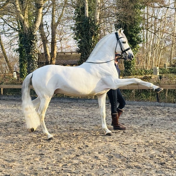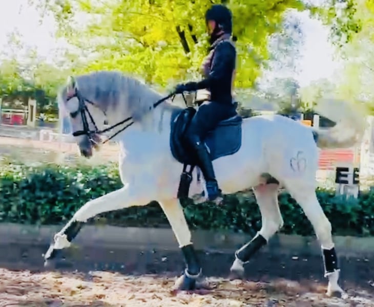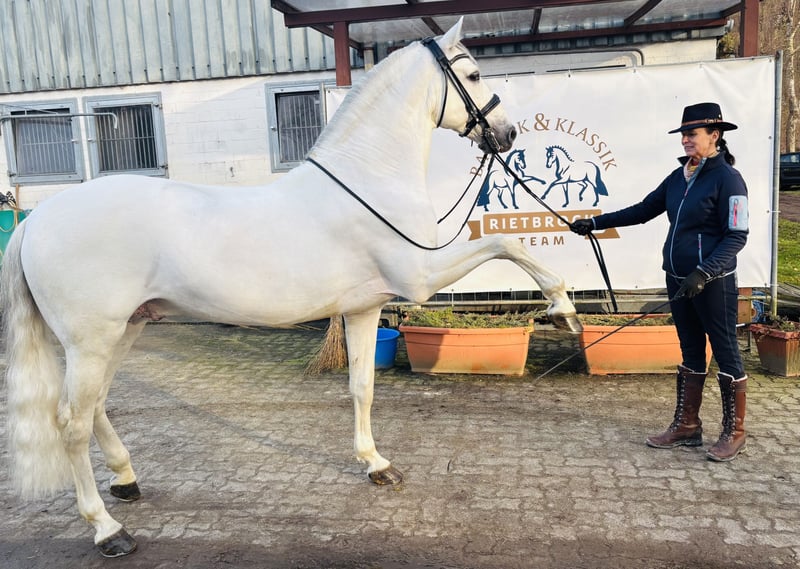A stunning grey with an excellent character and rideability, a horse that nearly fulfills all your wishes. Very comfortable to sit, with good basic movement typical of a PRE. It will only be placed in a loving and suitable home. For inquiries, please contact via WhatsApp at 01722420434. More information at BarockmeetsClassic.de
