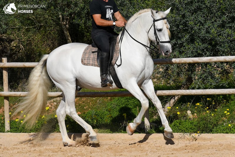Dieses beeindruckende weiße PRE-Pferd, registriert bei ANCCE und geboren im Jahr 2013, besticht durch seine natürliche Eleganz, sein klassisches Erscheinungsbild und seine ausdrucksstarken Bewegungen, die sofort ins Auge fallen. Mit einer Schulterhöhe von 1,62 m verfügt es über eine ausgewogene und funktionale Konformation – ideal für Reiter, die einen vielseitigen Partner für klassische Dressur oder kleinere Disziplinen suchen. Er ist das Kind des bekannten Hengsts Armas Felino und hat in der mütterlichen Linie einen Großvater, der als Zuchtverbesserer anerkannt ist. Das Pferd besitzt ein solides mittleres Ausbildungsniveau, arbeitet mühelos in Schritt, Trab und Galopp und führt seitliche Bewegungen sowie den spanischen Schritt korrekt aus. In der menorquinischen Dressur beherrscht es den Bot, was es zu einer hervorragenden Wahl sowohl für die Bahn als auch für Vorführungen oder Shows macht. Mit einem edlen, sensiblen und kooperativen Charakter ist es ein Pferd, das eine enge Verbindung zu seinem Reiter aufbaut. Es besitzt eine natürliche Sensibilität, die – weit entfernt von einem Nachteil – es besonders empfänglich für einen einfühlsamen und sanften Reiter macht, mit dem es eine tiefe, vertrauensvolle Beziehung entwickeln kann. Das Pferd ist an das Leben in der Box gewöhnt, lebt gemeinsam mit anderen Pferden, Stuten und Hengsten und verlässt regelmäßig die Stallung – sowohl allein als auch in Gesellschaft, auf der Bahn oder im Gelände. Es freut sich über die Gesellschaft anderer Pferde, bleibt dabei aber stets respektvoll und unter Kontrolle. Das Pferd wird entwurmt abgegeben und befindet sich in Menorca. Wir übernehmen gerne den gesamten Verkaufsprozess, inklusive tierärztlicher Untersuchung, Dokumentation und internationalem Transport bis zu seinem neuen Zuhause. 📩 Kontaktieren Sie uns für weitere Informationen, Fotos und Videos. Wir freuen uns, Ihnen behilflich sein zu dürfen!
