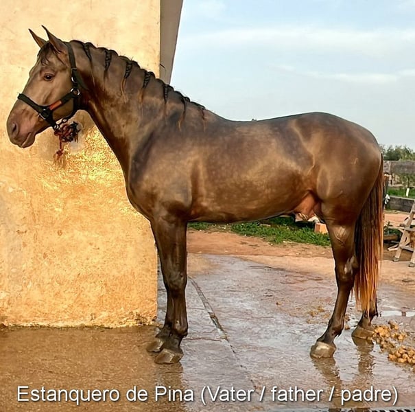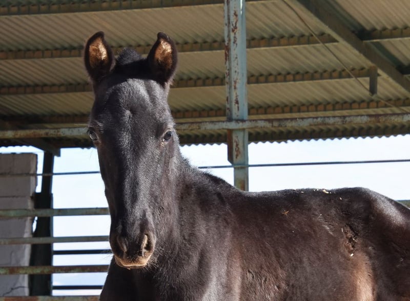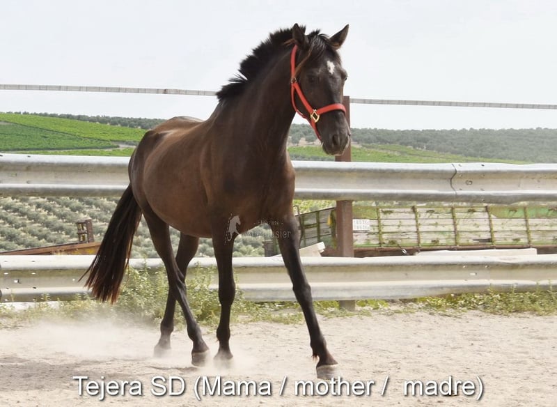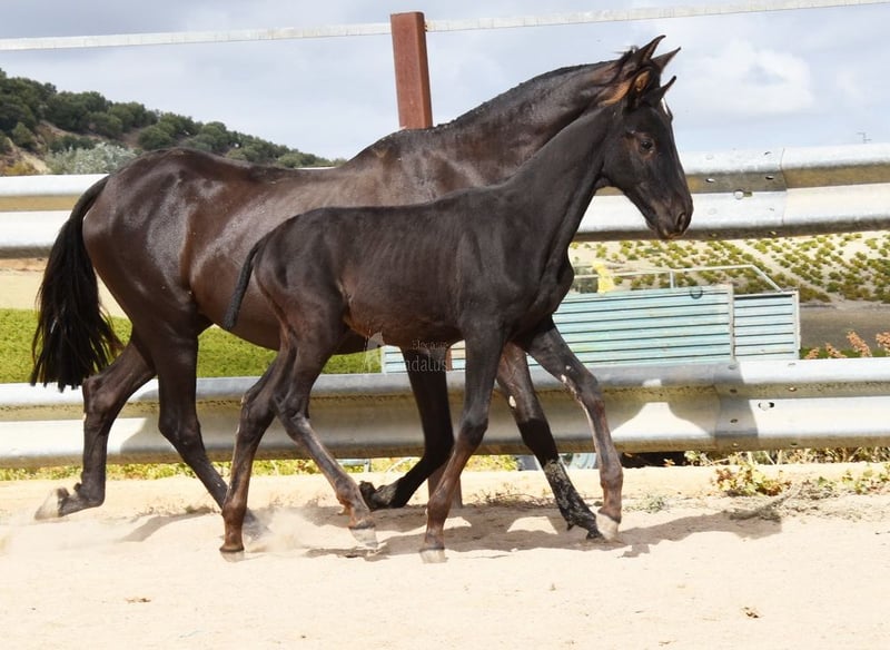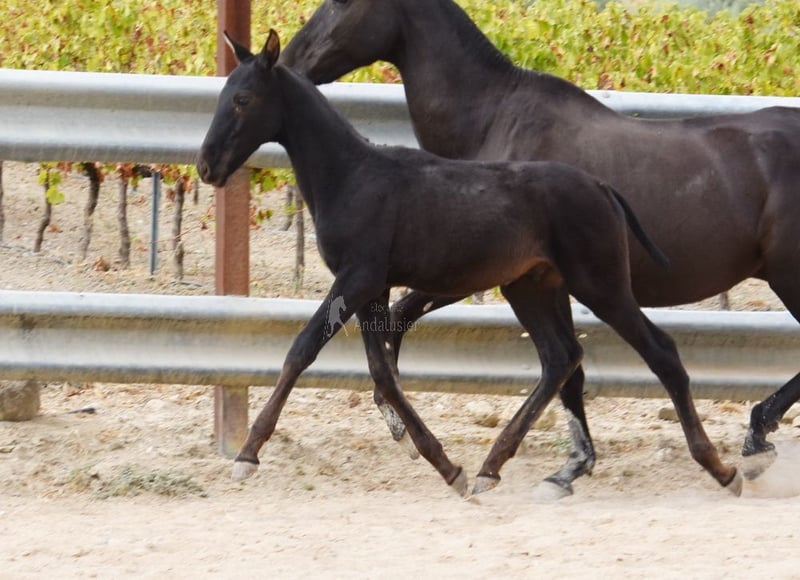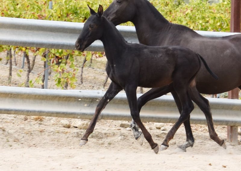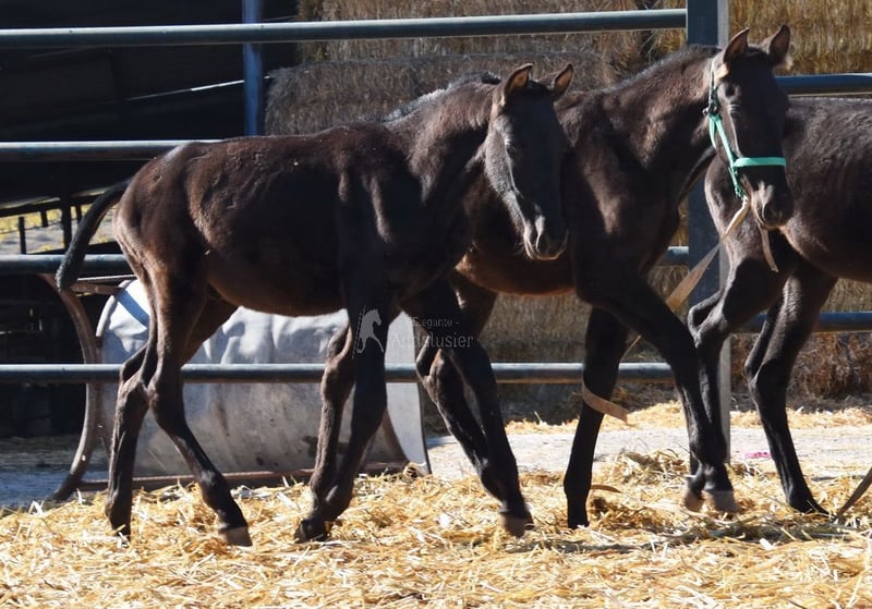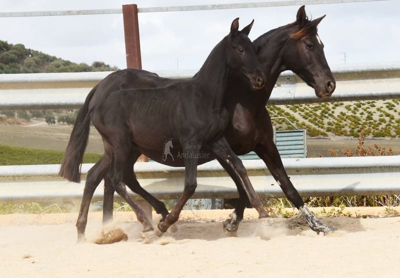caractère doux, curieux, brut, se tient dehors avec sa mère et d'autres juments et poulains, grand, couleur spéciale, noir avec gène PRL, ascendance : Antonio Guiral Guarga, Hnos Pina, Señorio de Bariain, Bohorquez www.elegante-andalusier.com