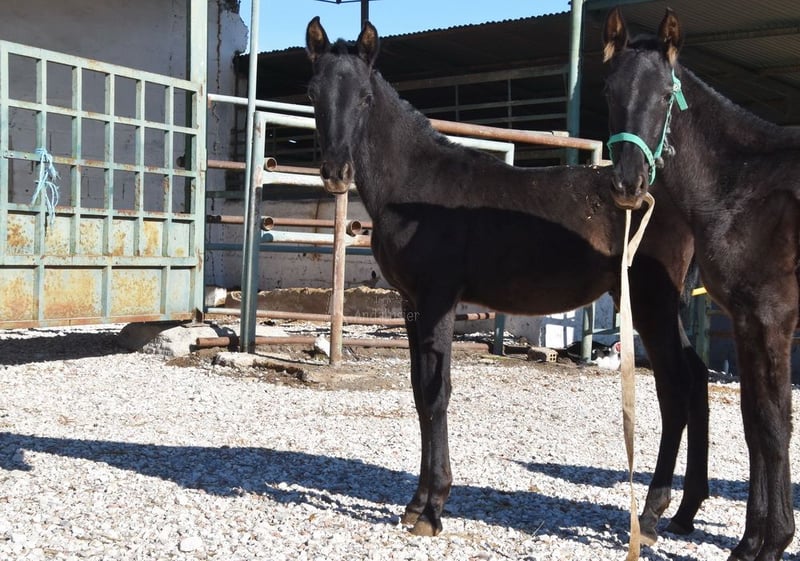 lieber Charakter, neugierig, roh, steht mit anderen Fohlen draußen, groß, spezielle Farbe, Rappe mit PRL-Gen, Abstammung: Antonio Guiral Guarga, Hnos Pina, Señorio de Bariain, Bohorquez www.elegante-andalusier.com