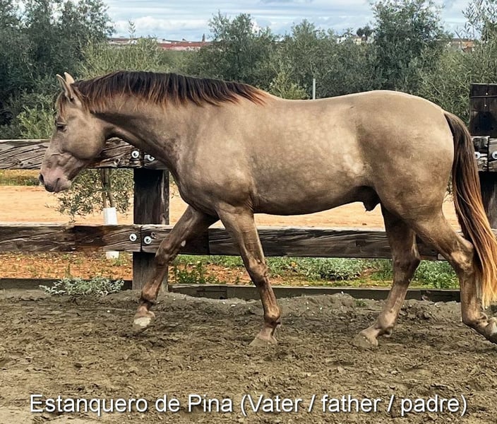 Carácter amable, curioso, algo salvaje. Está al aire libre con su madre, otras yeguas y potros. Es grande, de color especial: caballo alazán con gen PRL. Pedigrí: Antonio Guiral Guarga, Hnos Pina, Señorio de Bariain, Bohorquez. www.elegante-andalusier.com