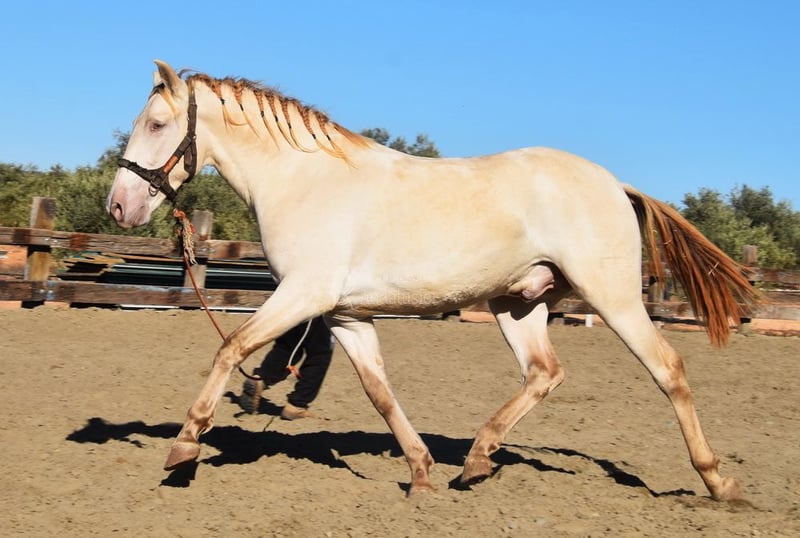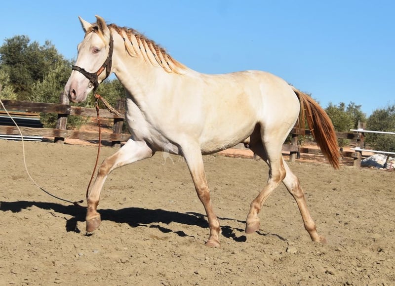 Sweet temperament, raw, recently backed, tall, baroque build, good movement and pedigree, special color, bay perlino with PRE papers. Pedigree includes Torreluna, Millán Herce, Ganadería Antares, Yeguada Militar, with several qualified ancestors. www.elegante-andalusier.com