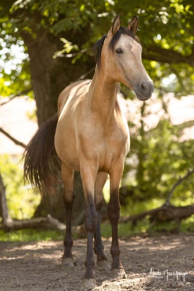 Allow me to introduce: Magic Joy’s Dante, an impressively large-framed PRE foal with an elegant appearance, a calm temperament, and the rare coat color buckskin (falabella – color test available). Born: April 9, 2024 Pedigree: – Sire: Dagon Uco (1.62 m) – expressive, baroque PRE stallion with excellent gaits and a commanding presence – Dam: Bruja MMJ (1.68 m) – tall, rideable mare with a balanced character and strong nerves Studbook: full ANCCE papers Current height: approximately 1.58 m – expected final height over 1.65–1.70 m Dante combines his dam’s coolness and composure with his sire’s elegance and collection ability. Due to his impressive size, rare color, and friendly, people-oriented character, he is a real eye-catcher with excellent potential for dressage, working equitation, or demanding leisure riding, especially for those who value character, rideability, and charisma. He is raised with us in a sturdy open stable environment, together with other foals and young horses. This ensures he is well socialized, familiar with all daily environmental influences (tractors, sheep, cows, chickens, playing children, etc.) and consistently displays curiosity and calmness. We place great importance on a natural weaning process – Bruja has gently weaned Dante, so he is now ready to find a new home. Upon request, he can also remain with us at Magic Joy Stud for further upbringing. 📍 Location: PRE Stud Farm Magic Joy, Feuchtwangen (Bavaria) 🌐 www.pre-zucht-magic-joy.de 📞 For inquiries or questions, we look forward to your message: WhatsApp 017631763049