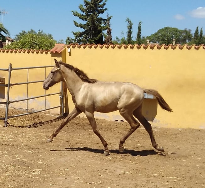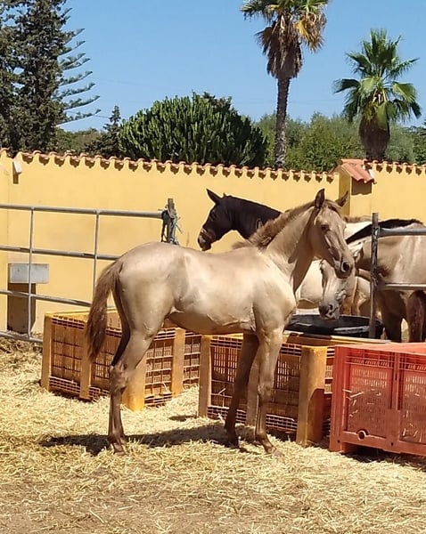 Jährlings-PRE-Hengst in wunderschöner Champagner-Farbe mit goldschimmerndem Glanz und ausgezeichnetem Charakter. Neben seiner Schönheit verfügt er über einen sehr guten Stammbaum mit Yaco II-Blutlinie in seiner Abstammung. Da er doppelt PRL-trächtig ist, wird er stets das PRL-Gen weitergeben können – er kann Champagne- und Pearls-Fohlen zeugen. Er wird in einer Piroplasmose-freien Zone frei gehalten.