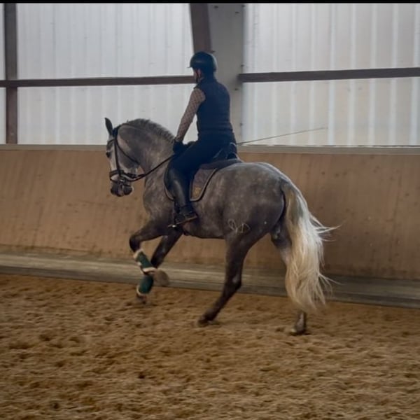 Tejon ist ein 3j PRE Hengst, derzeit in den GGA angeritten. Er ist ein liebenswertes, ruhiges Pferd im Umgang, stets neugierig und offen. Tejon ist Menschen bezogen und benötigt seine Kuscheleingeiten. Es macht sehr viel Freude mit Tejon zu arbeiten, egal ob vom Boden oder beim reiten. Tejon bringt einen sehr guten Schritt mit, hat einen raumgreifenden Bergauf Galopp. Im Trab arbeiten wir an der Balance,Takt u. Losgelassenheit wie es für einen solchen Youngster normal ist. Dieser Rohdiamant bringt viel Bewegungspotential mit, gepaart mit Sitzcomfort und super lieben Charakter . Zur Zeit reite ich ihn 3x in der Woche leichte 20 Minuten. 1x im Monat trainiere ich meine Pferde mit André Keus, Pferdewirtschaftsmeister damit die Ausbildung immer altersentsprechend nach der Skala der Ausbildung (FN) erfolgt. Tejon liebt es mit dem Menschen umzugehen u. lernt sehr schnell. Er hat 18 Röntgenbilder nach deutschem Standard ohne Befund. Auf den Bildern seht Ihr, dass ich ihn in Spanien bei meinen Freunden auf dem Gestüt selbst angeritten habe und er nun seid Anfang Okt. Bei uns im Reithaus am Emstal altersgemäß weiter ausgebildet wird. Das ist meine Freude u. Passion! Probereiten biete ich nur in einer von mir geführten Unterrichtsstunde im Wert von 75 € an, da es sich hier um ein sehr junges Pferd handelt. Termine mache ich in zeitlichen Abständen so dass es für das Pferd machbar ist. In Kooperation mit unserer Tierklinik ist eine Kastration möglich, als auch die Nachsorge und das anschließende antrainieren.. Gleichzeitig bieten wir unseren Kunden den Transport des Pferdes ins neue zu Hause an. Bei ernsthaftem Interesse bitte Anfragen nur per WhatsApp 0171-3776471