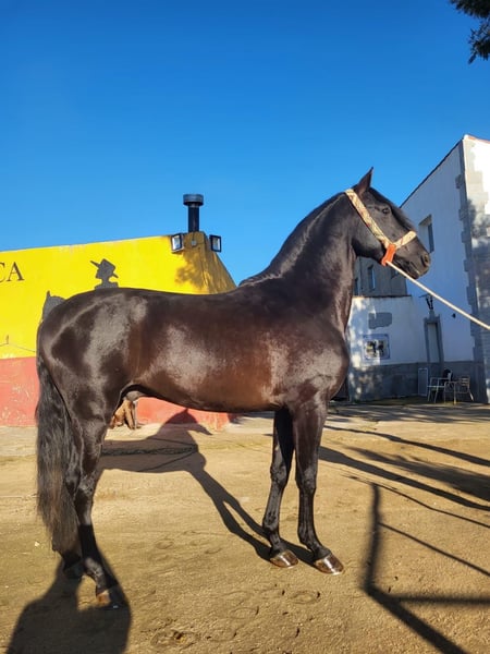 Wir verkaufen in Kooperation mit unserem spanischen Partner hier einen vierjährigen schwarzen Hengst mit den wirklich besten Eigenschaften. Triguero verfügt, neben seiner strahlenden Erscheinung, über viele Eigenschaften die man sich für ein Pferd in diesem Alter wünschen kann. Er ist sehr menschenbezogen und immer aufmerksam wenn man ihm etwas beibringen möchte. Unter dem Sattel ist er sehr aufmerksam und sehr gut zu leiten. Seine Kindheit/Jugend verbrachte er völlig artgerecht auf äußerst weitläufigen Weiden im Herdenverband mit gleichaltrigen Hengsten. Die Ausbildung verlief, auch aufgrund seines positiven Charakters, völlig komplikationsfrei, sehr einfühlsam und vorsichtig. Er läuft bereits einigermaßen sicher in allen Grundgangarten und auch der "spanische Schritt" bereitet ihm keine großen Probleme Er hatte bisher in seinem Leben wirklich so gut wie keine Gelegenheit schlechte Erfahrungen zu sammeln. Aufgrund seiner Abstammung und seines Charakters ist er auch für Züchter interessant. Gerne beantworten wir Ihre weiteren Fragen. Der Preis versteht sich ab Spanien. Auf Wunsch organisieren wir natürlich alle notwendigen weiteren Schritte. Aufgrund seiner
