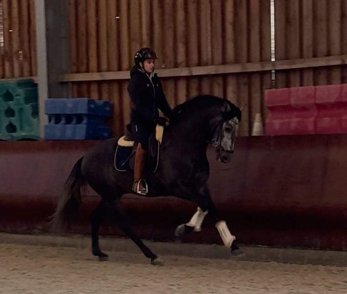 Schöner 4-jähriger P.R.E. Hengst, seit einigen Wochen schonend unter dem Sattel. Er zeigt sich sehr kopfklar, freundlich und mit einer angenehmen Einstellung zur Arbeit. Für sein junges Alter ist er ausgeglichen und macht täglich positive Fortschritte. Der Hengst verfügt über drei gute bis sehr gute Grundgangarten mit viel Qualität. Der Schritt benötigt aktuell noch etwas Zeit zum vollständigen Loslassen, was alters- und ausbildungsbedingt ist. Trab und Galopp zeigen sich aktiv, gut ausbalanciert und mit schöner Mechanik. Er ist unkompliziert im Umgang, brav im täglichen Handling und vermittelt dem Reiter ein sicheres Gefühl. Gute Röntgenbilder sind vorhanden. Der Hengst steht derzeit in Luxemburg und kann nach Absprache gerne vorgestellt werden.