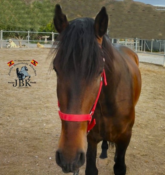 Bizarro est né le 08.01.2022. Il est issu des lignées Plaza de Armas, Bolix, Miura, Moreno Lovera et Guardiola. Il mesure actuellement 1,65 m au garrot. Bizarro connaît l'ABC du poulain, est désormais habitué à la selle et au filet et se laisse monter sans problème aux trois allures sur le terrain lors de courtes reprises. Au niveau du caractère, c'est un amour. Si vous avez envie d'un jeune cheval aussi formidable, nous avons ici un excellent spécimen.