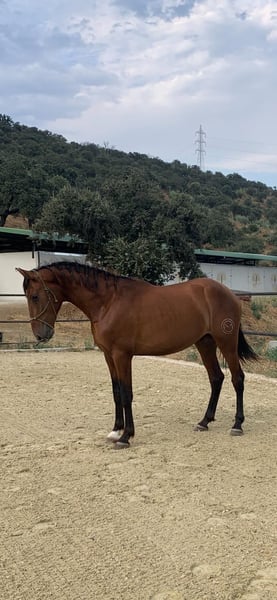3 year old bay PRE stallion in sport type. Entered in the ANCCE studbook. He transmits the PRL gene, so he will do well in breeding horses with diluted coloured coats. (His sire ROMANCE ABAD is isabela in the last photo). His grandfather on his dam's side is YULIO JEM, passing on great dressage movement, both his siblings and offspring compete in dressage, also internationally with very good results. A horse raised free-ranging 24/7, he has recently been in a stable and has started working from the ground. Eager to work with humans, very good character. Videos in movement on whatsapp. Currently located in Spain.