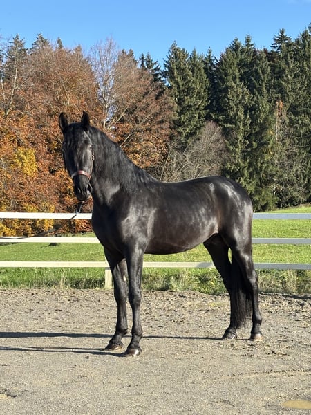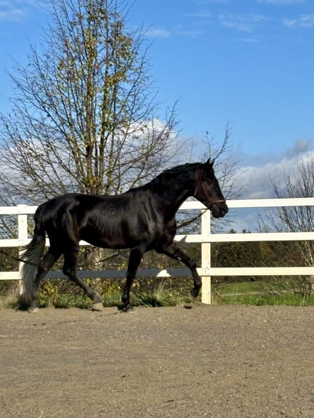 For sale is this exceptional, licensed black stallion, RAHEGO SH. A stunning son of DIVORCIADO from the renowned YEGUADA VALDEOLIVAS breeding program. This extraordinary stallion impresses not only with his size and unique beauty but also with his high-quality basic gaits. His walk is outstanding, his trot mechanics are convincing, and he exhibits a beautiful uphill canter. It is rare to find such movement potential in PREs of this caliber. He has been gently and age-appropriately trained and developed directly by the breeder. RAHEGO SH displays a completely clear mind and is not stallion-like. He possesses a consistently honest character and is a true dream horse. Anyone seeking a soulmate should take a close look at him. Veterinary certificate available, with no notable findings. General information about getting to know our horses: We make every effort to introduce the horses to a trusting riding life. We are happy to present the horses lunged and under saddle. Serious buyers are, of course, welcome to try riding and work from the ground. A viewing fee of 50 euros per visit applies to help us protect our sale horses from the current trend of excessive trial rides. We have found that our horse buyers appreciate that their future horse has not been tried by too many different hands. Thank you for your understanding. You are also welcome to combine your horse search with a few days of vacation. Our cozy holiday apartments directly on the stud farm allow you to get to know the horses around the clock. If you are interested or need further information, I am happy to assist. Please contact me to learn more about this charming leisure mare!