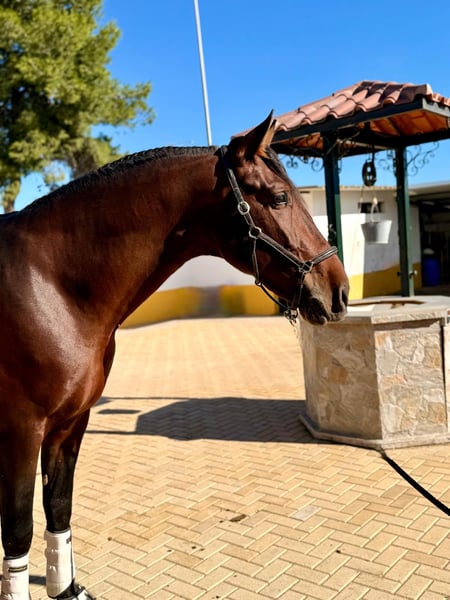 This exclusive PRE dressage stallion is for sale! This dark bay beauty not only impresses with his imposing appearance but also with his excellent character. With a height of 1.72 m, he is ideal for taller/stronger riders. The young stallion shows enormous potential in dressage and is ready to reach new heights with the right rider! Orquideo grew up at our stable and has been gently trained. On a snaffle bit, of course! He has three excellent basic gaits and has already been ridden at A level. Orquideo has already been successfully presented in the young horse test for 4-year-olds and immediately took first place! Orquideo has a great character and shows no stallion behaviour, even in a large, mixed stable! If you are looking for a promising young horse that impresses with both its looks and its abilities, then this PRE stallion could be just right for you. Of course, Orquideo comes from the very best breeding and has full PRE papers and the best pedigree! The El Ancla stud farm in Cádiz is currently a benchmark in PRE dressage and is particularly well known for the sporting achievements of its horses, such as Quincallero Ancla II at the World Championships for Young Horses and Guaro V, who won the Ancce Cup in the young horse category. Location: Spain – transport can be organized worldwide! Piro free & fully vetted!