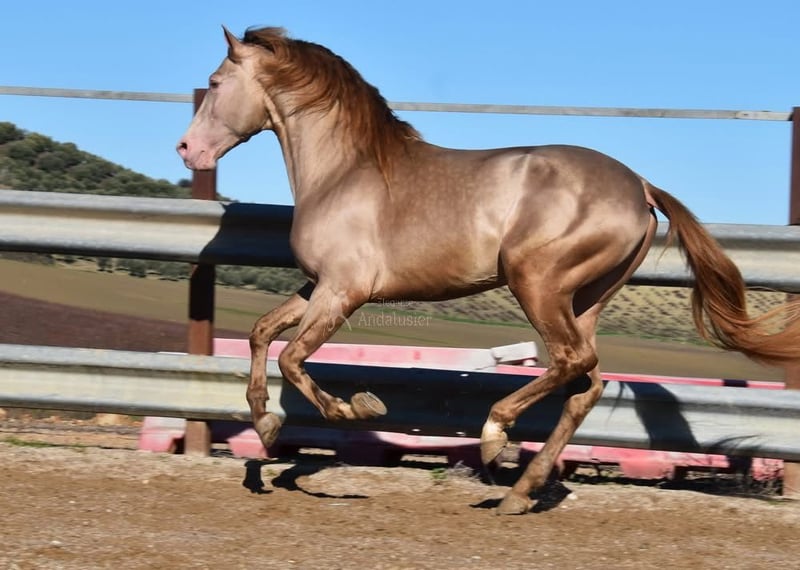 Caractère doux, calme, curieux, joueur et affectueux. Monté en allures de base, adapté à la randonnée. Grand, de style baroque, confortable. Cheval de reproduction, étalon, couleur spéciale. Baya Perla (CrPrl) avec papiers PRE. Radiographies bonnes, Piro négatif. Origines : Antonio Guiral Guarga, Castillo Villafranca, Paco Martí. www.elegante-andalusier.com