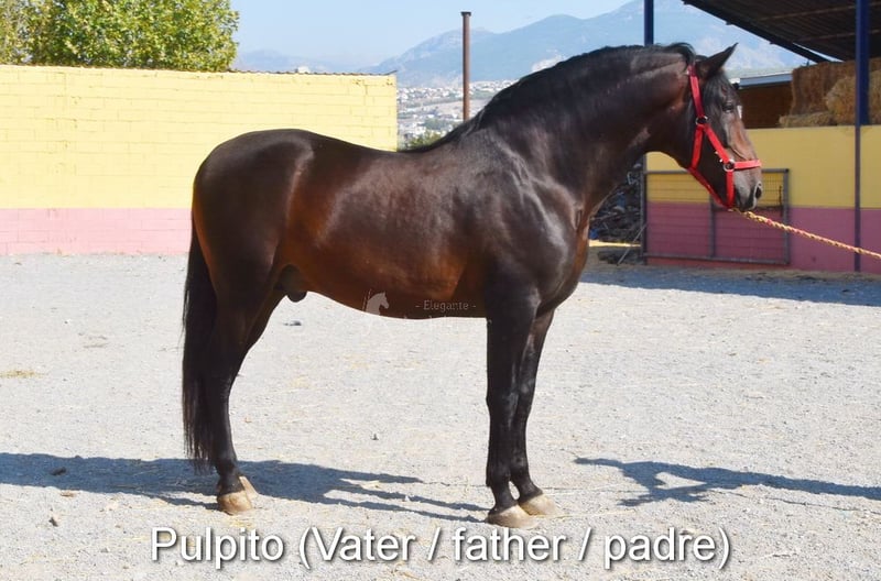 Carattere dolce, tranquillo, curioso, giocoso e affettuoso. Montato in passo, trotto e galoppo su terreno. Di statura grande, di stampo barocco, comodo, stallone da monta, con colore speciale, Baya Perla (CrPrl) con pedigree PRE. Radiografie di buona qualità e Piro negativo. Pedigree: Antonio Guiral Guarga, Castillo Villafranca, Paco Marti. www.elegante-andalusier.com
