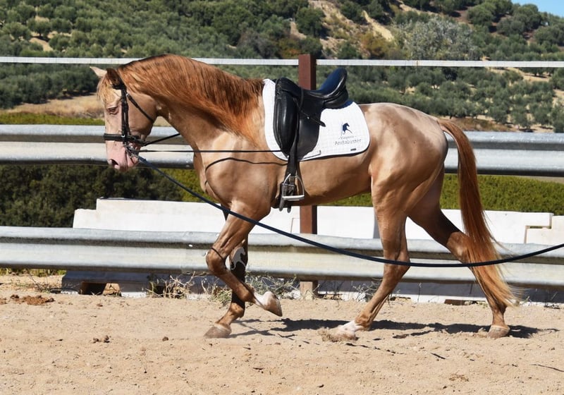 Caractère doux, calme, curieux, joueur et affectueux. Monté en allures de base, adapté à la randonnée. Grand, de style baroque, confortable. Cheval de reproduction, étalon, couleur spéciale. Baya Perla (CrPrl) avec papiers PRE. Radiographies bonnes, Piro négatif. Origines : Antonio Guiral Guarga, Castillo Villafranca, Paco Martí. www.elegante-andalusier.com