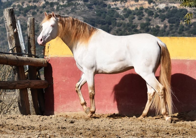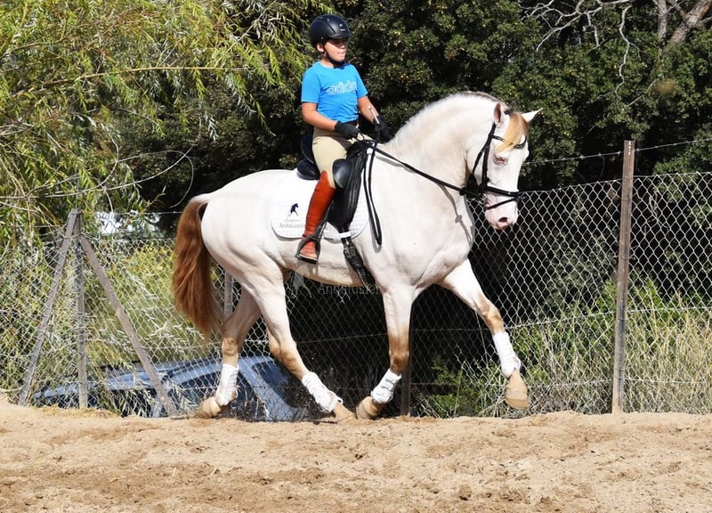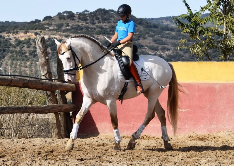 Charactère doux avec un tempérament agréable, curieux et câlin, monté en allures de base, exercices de côtés, reculer, pas espagnol, début de piaffer et de passage, se plie, en terrain, grand, bons mouvements, couleur spéciale, Bayo Perla (CrPrl) avec papiers PRE, inscrit, Piro négatif, adapté aux enfants et aux cavaliers peu expérimentés. Ascendance : Yeguada san Benito Abad, Paco Martí, Yeguada la Llana, Ururopa Gaucho III est qualifié. www.elegante-andalusier.com
