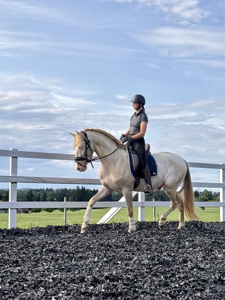 REY SH, the king of the stable. With his extraordinary color and crystal blue eyes, he attracts everyone's attention. He is absolutely charming and affectionate towards his humans. This horse is not only a visual highlight because of his color; his beautiful conformation and his ability to move gracefully make him a promising equine partner. Due to his color, REY is a special gem that requires appropriate care. Horses of this color need more attention and intensive grooming. They are often a bit slower in physical maturity compared to their peers. Thanks to his sweet character, he makes it easy for his trainers. Although he is still a bit soft in his foundation, he can be reliably ridden in all three gaits. The unicorn enjoys little excursions in our fairy tale forest. Due to his color with the double pearl gene, he is also an interesting horse for breeders, capable of passing on special colors such as Bayo, Perlino, Bayo Perla, etc. He has already received his approval. REY SH has grown up in a species-appropriate manner at his breeder in Galicia and has been happily roaming in a herd on extensive grounds. Great emphasis is placed on good feed management and regular deworming. His hooves are also regularly checked and treated as needed. He has never had negative experiences, so he gives his full trust to humans. General information for getting to know our horses: The horses are usually either unstarted or gently started when they come to us. We make every effort to introduce the horses to the riding life in a trusting manner. We are happy to present the horses on the lunge and under the rider. If there is serious interest in purchasing, trial rides and groundwork sessions are, of course, possible. A protection fee of 50 euros per visit is charged during the viewing period. This protects our sale horses from the trend of trial tourism. We have found that our horse buyers appreciate that their future horse has not been tried by too many hands. Thank you for your understanding. You are also welcome to combine your horse search with a few days of vacation. Our cozy holiday apartments directly at the stud allow you to get to know the horses 24 hours a day. For more information or to schedule a viewing appointment, please contact us. We look forward to hearing from you!