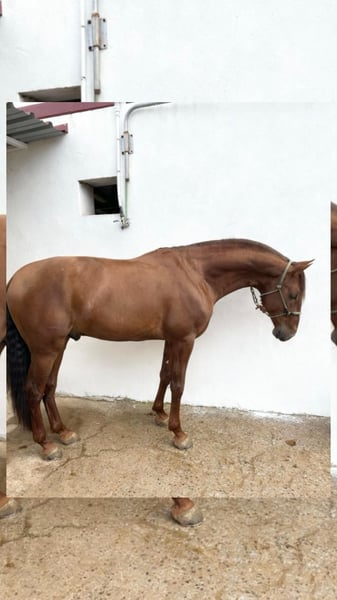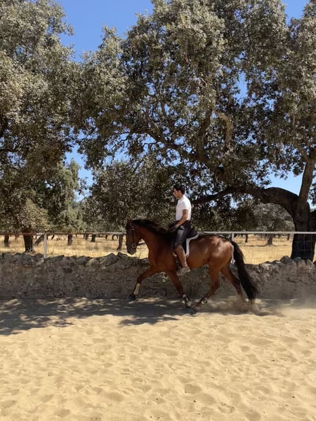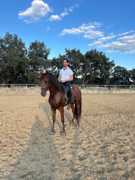 Introducing Zurrón Aran, a 5-year-old PRE stallion renowned for his exceptional beauty, with a striking chestnut coat and an impressive presence that commands attention. This horse has a strong personality, courage, and good impulsion, currently progressing within the 5-year-old young horse dressage level. He works correctly in leg yields and rein-back, demonstrating a solid foundation with room for further development. He is accustomed to going out into the countryside and around the village, exhibiting good behavior outside the arena. Additionally, he possesses excellent qualities as a future breeding stallion, with notable genetic potential to pass on diluted coat colors—a valuable asset for breeding programs. A complete horse: with outstanding appearance, attitude, and potential—ideal for both sport and selective breeding.