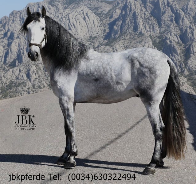 PRE étalon Abogado Arcos est né le 16.05.2021. Il a grandi en troupeau, a été mis en box à l'âge de 3 ans et est maintenant monté de manière solide et sûre dans les allures. Il connaît également de petites sorties aux alentours. Un cheval qui travaille de manière solide et sérieuse. On ne peut attendre de lui aucune bêtise. Car son nom même évoque la souveraineté. Abogado est un petit-fils de l'étalon Elite EDUCADO X de l'élevage Guardiola, Miura, Novales, Bariain, Muñoz et Terry complètent parfaitement la lignée.