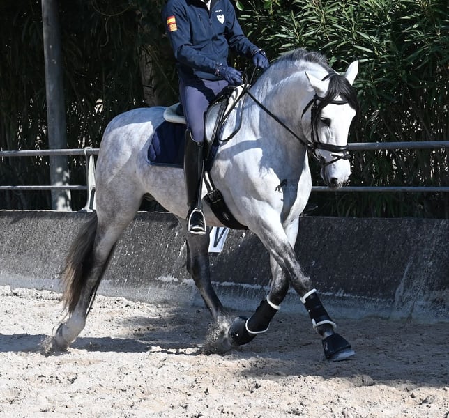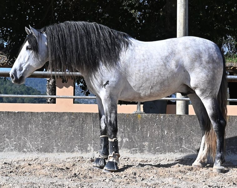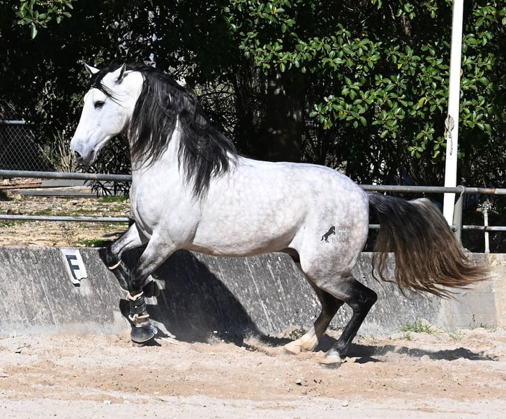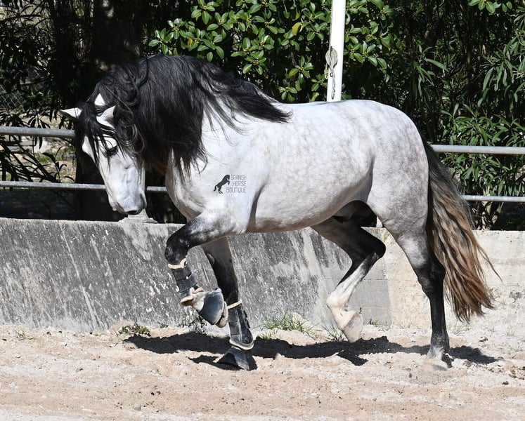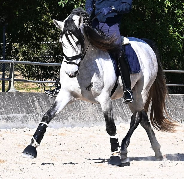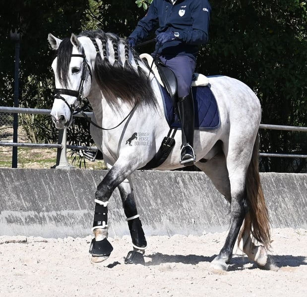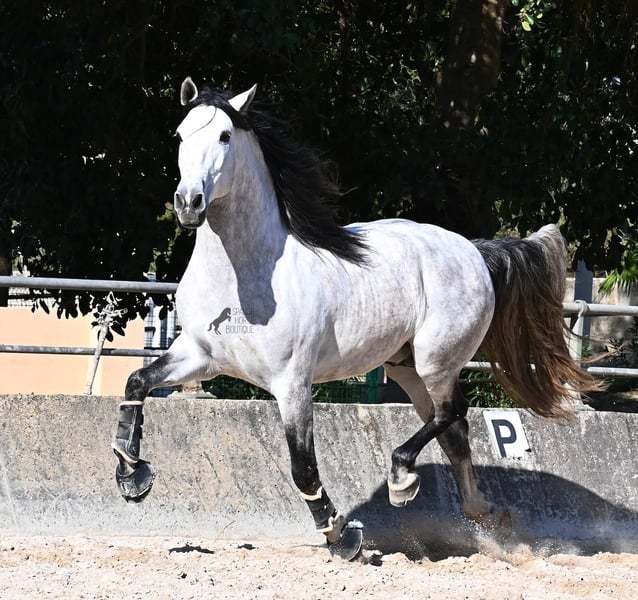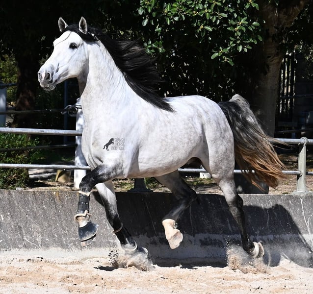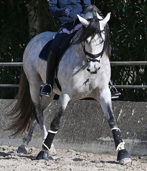This 2021-born purebred PRE stallion (Andalusian with registration papers from ANCCE) is so stunning and majestic that his appearance takes your breath away. Baroque, expressive, with a refined head and gentle eye, he exhibits magnificent movement while remaining gentle. He embodies the ideal image of the Spanish horse, which is no surprise, as he comes from one of the world's top breeders, with lineage tracing back to PRE ancestors and is a progeny of the exceptional stallion JUDIO VII. On his sire’s side, he is nearly pure Bohorquez—baroque horses known for their friendly nature, work ethic, and lively movement. His dam’s lineage will excite Cartujano enthusiasts: VILAIRE, MARIN GARCIA, and VIUDA DE TERRY dominate. Exclusive breeding selection always pays off, and this stallion demonstrates it perfectly! Standing at 169 cm (16.1 hh), he has a proud stature, with a few centimeters to spare. He could hardly be more baroque, with an impressive neck, strong topline, and croup. What makes him special is that he is not heavy but moves with expansive, elastic, and supple gaits. He would also be an interesting candidate for Working Equitation! In handling, he is absolutely well-behaved and could not be more obedient. At this breeder’s, all stallions grow up late on large mountain-like pastures in the young horse herd. They are always well cared for afterward, resulting in clear-headed, friendly, social, and robust horses thanks to their upbringing. Under saddle, he is consistently attentive, ridden in a double-broken bit, and his training emphasizes a healthy balance between work and rest phases. After trotting and cantering, he is often walked a few rounds at a relaxed long rein to maintain his motivation to work, allowing him to stretch and relax when the lessons are well executed. He is capable of lateral work in all gaits, can piaffe from the walk, and maintains rhythm in canter when given the reins. He is licensed but has not yet been used for breeding. For those who cannot or do not wish to keep a stallion, castration on-site is of course an option. X-rays were taken in January 2026 and are available upon request. A true dream horse with a good character, from a top-quality lineage, and of the highest quality. Price reflects his quality and is very fair! Location: Mallorca. Videos and pedigree available upon request. I am happy to organize a pre-purchase exam, training, castration, transport, or even your journey if you wish to visit in person. Details can be found on my website or discussed directly. Greetings from Spain