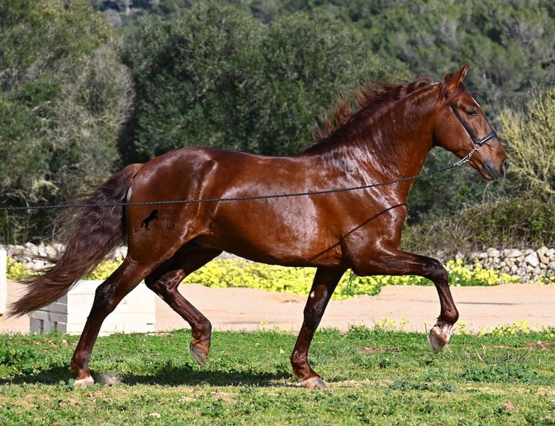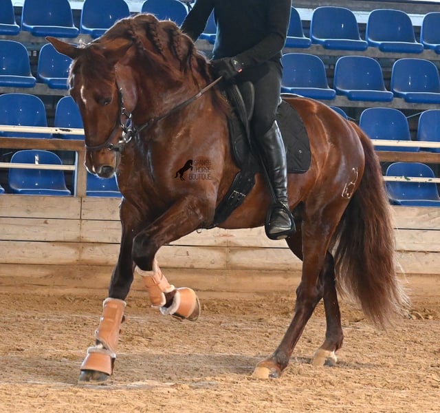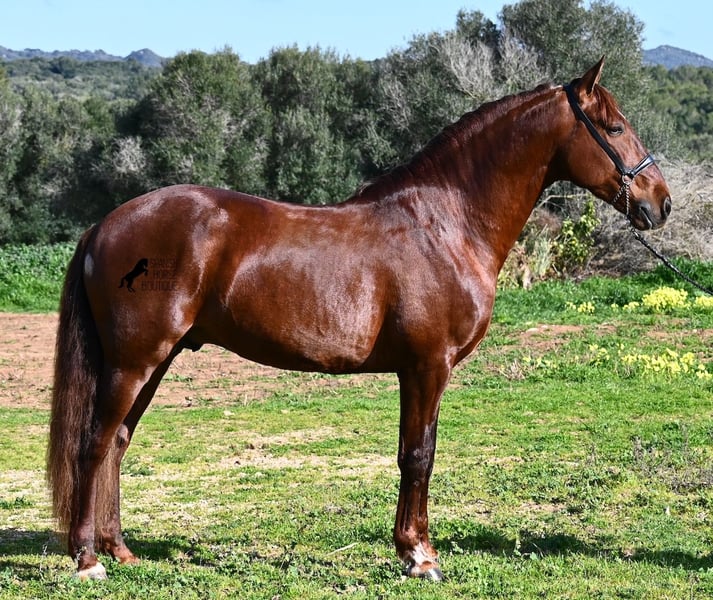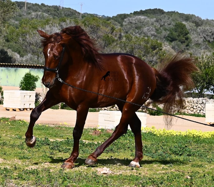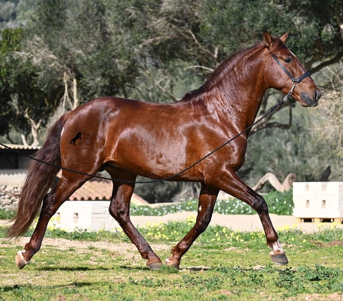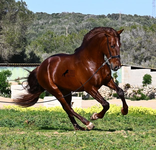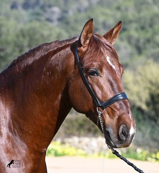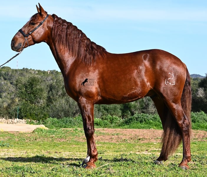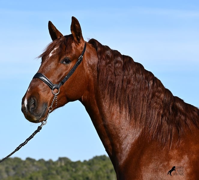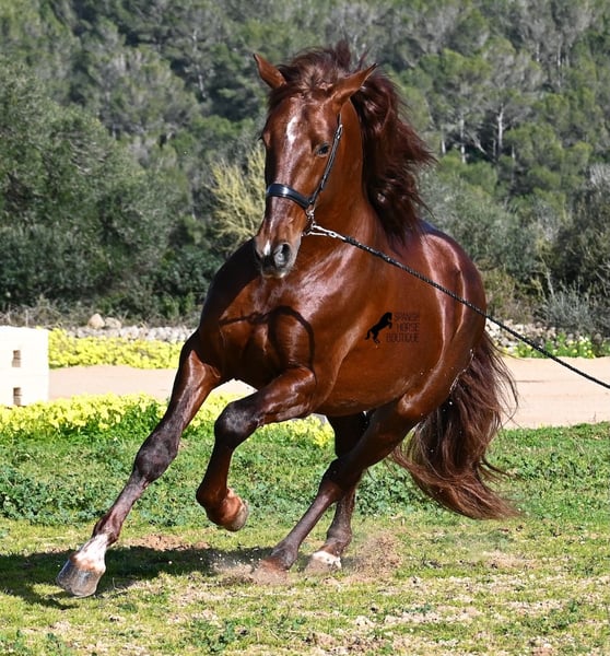 This PRE stallion (Andalusian with ANCCE breed certificate), born in 2020, is a real feast for the eyes in many respects! Without a doubt, the first thing you notice is his breathtaking beauty, which is only enhanced by the copper engraving in his coat and his esprit. But behind the beautiful façade, there is much more to discover. His pedigree is superior, as he is a son of the multiple WORLD CHAMPION Fer Bonachon de Eda and therefore a grandson of the famous Fer Bago. In his pedigree we find not only the world champion and thus the FERRERO line, but also Monis, Marin Garcia, Yeguada Militar, Guardiola and Bohorquez! On his dam's side, he has black, chestnut and bay in his pedigree, which also makes him very interesting as a breeding stallion, as most Bonachon children resemble their sire as gray and he passes on this TOP line, with more options for colored offspring. He is licensed and already has one offspring - also a chestnut, which confirms that he is more than interesting as a breeding stallion in terms of color, in addition to his pedigree. He is an absolute gentleman in handling and although he has already covered, he is not at all hot or stubborn. If stallion keeping is not possible, there is of course the option of castration on site. Ambitious riders will definitely have fun with him, because he learns quickly if you have the necessary sensitivity to channel his Spanish flame (fire would be an exaggeration), because under the rider he wants to give everything and really thaws out. He doesn't show any naughtiness under saddle either, but always wants to show more, which makes it better for him to have a rider who brings him into walk briefly on the long reins instead of pushing him. A beautiful stallion with a lot of potential in various disciplines that will please the eye and the heart! The price corresponds to the quality. His current height is 160cm. He is currently standing in Menorca! Videos and pedigree available on request. I would be happy to organize an AKU, castration, riding, transport or even your trip if you come to see him in person. Details can be found on my website or in conversation. Saludos from Spain