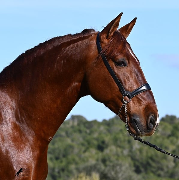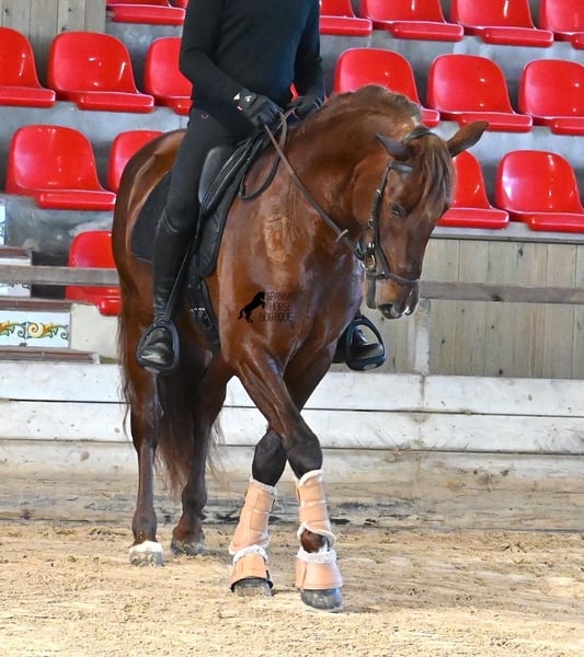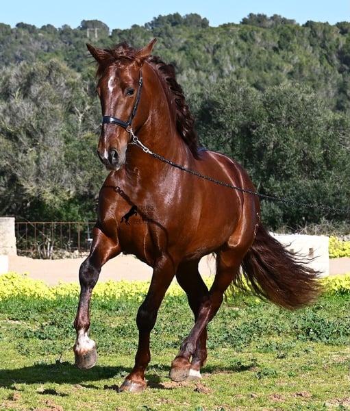 Questo stallone PRE nato nel 2020 (Andaluso con certificato di razza ANCCE) è, sotto molti aspetti, una vera meraviglia per gli occhi! Indiscutibilmente, la sua straordinaria bellezza colpisce subito, accentuata dal riflesso rame del suo manto e dal suo spirito vivace. Ma dietro questa bella facciata c'è molto di più da scoprire. La sua discendenza è superiore, poiché è un figlio del pluricampione del mondo Fer Bonachon de Eda e quindi un nipote del famoso Fer Bago. Nella sua genealogia troviamo non solo il campione del mondo e quindi la linea FERRERO, ma anche Monis, Marin Garcia, Yeguada Militar, Guardiola e Bohorquez! Da parte materna ha purosangue, baio e morello nella sua discendenza, il che lo rende molto interessante come stallone da allevamento, poiché la maggior parte dei figli di Bonachon somigliano al padre come baio e lui trasmette questa LINEA TOP, con maggiori possibilità di prole colorata. È stato approvato e ha già una prole, incluso un baio, il che conferma che, oltre alla sua discendenza, è molto interessante come stallone da allevamento anche per il colore. Nella gestione è un vero gentiluomo e, sebbene abbia già coperto, non è affatto caldo o stallonoso. Se non fosse possibile tenerlo come stallone, c'è naturalmente l'opzione di castrazione in loco. Cavalieri ambiziosi si divertiranno sicuramente con lui, poiché impara rapidamente, se si ha la sensibilità necessaria per canalizzare la sua fiamma spagnola (fuoco sarebbe esagerato), poiché sotto il cavaliere vuole dare il massimo e si svela completamente. Anche sotto sella non mostra assolutamente cattive abitudini, ma desidera sempre dimostrare di più, per cui è meglio avere un cavaliere che lo porti brevemente al passo con le redini lunghe, piuttosto che spingerlo. Un bellissimo stallone, con molto potenziale in diverse discipline, che rallegra gli occhi e il cuore! Prezzo in base alla qualità. La sua attuale altezza al garrese è di 160 cm. Attualmente si trova a Maiorca! Video e genealogia disponibili su richiesta. Posso organizzare in loco un controllo veterinario, castrazione, addestramento, trasporto o anche il vostro viaggio, se desiderate venire di persona a vederlo. Maggiori dettagli sono disponibili sul mio sito o in conversazione. Saluti dalla Spagna!