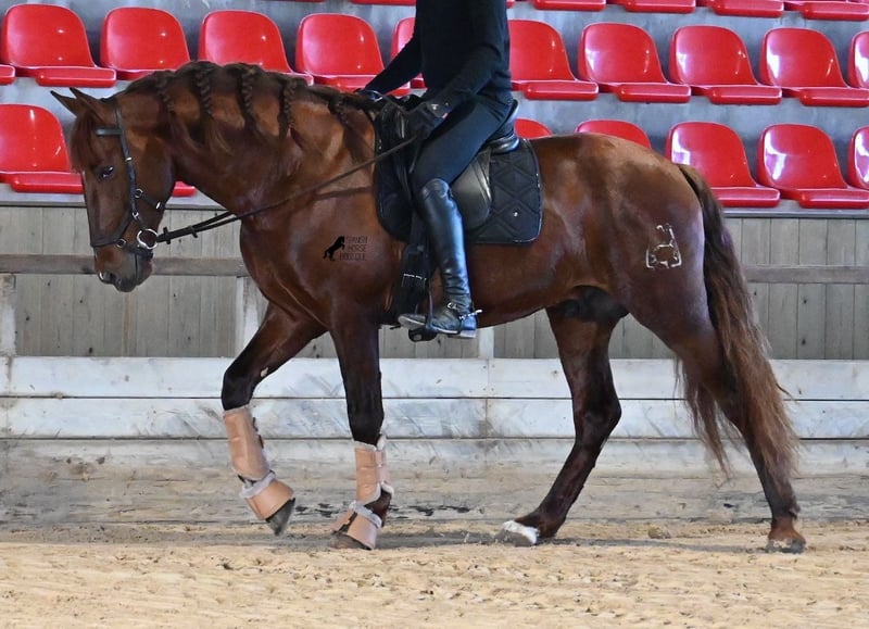 Ce hongre PRE (Andalou avec preuve de race de l'ANCCE), né en 2020, est une véritable merveille à bien des égards ! Il est indéniable que sa beauté époustouflante attire immédiatement l'attention, renforcée par les reflets cuivrés de son pelage et son esprit. Mais derrière cette belle façade, il y a beaucoup plus à découvrir. Sa lignée est supérieure, car il est le fils du multiple CHAMPION DU MONDE Fer Bonachon de Eda et donc le petit-fils du célèbre Fer Bago. Dans sa généalogie, nous trouvons non seulement le champion du monde et donc la lignée FERRERO, mais aussi Monis, Marin Garcia, Yeguada Militar, Guardiola et Bohorquez ! Du côté maternel, il a des chevaux noirs, des alezans et des bai dans sa lignée, ce qui le rend également très intéressant en tant qu'étalon, car la plupart des enfants de Bonachon ressemblent à leur père en tant que gris et il transmet cette lignée TOP, avec plus d'options pour une descendance colorée. Il est approuvé et a déjà une descendance, également un alezan, ce qui confirme qu'il est coloré en tant qu'étalon, en plus de sa lignée, plus qu'intéressant. En manipulation, c'est un véritable gentleman et bien qu'il ait déjà sailli, il n'est pas du tout chaud ou étalon. Si le maintien en tant qu'étalon n'est pas possible, il y a bien sûr l'option de la castration sur place. Les cavaliers ambitieux s'amuseront certainement avec lui, car il apprend vite, à condition d'avoir le sens nécessaire pour canaliser sa flamme espagnole (le feu serait exagéré), car sous le cavalier, il veut tout donner et se révèle vraiment. Même sous la selle, il ne montre absolument aucun vice, mais veut toujours en montrer plus, ce qui fait qu'un cavalier qui le ramène brièvement au pas en longe est préférable à un cavalier qui le pousse. Un magnifique hongre, avec beaucoup de potentiel dans divers domaines, qui ravira les yeux et le cœur ! Prix en fonction de la qualité. Sa taille actuelle est de 160 cm. Il est actuellement à Majorque ! Vidéos et généalogie disponibles sur demande. Je peux organiser sur place une visite vétérinaire, une castration, un débourrage, un transport ou même votre voyage si vous souhaitez venir le voir en personne. Détails disponibles sur ma page ou lors d'une conversation. Salutations d'Espagne.