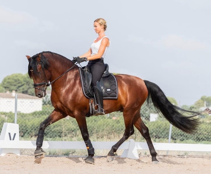 On behalf of a client: Habilidoso is a 5-year-old, baroque PRE stallion for the highest demands! Under saddle, he is always reliable and extremely willing to perform! He is very fine to ride and learns extremely quickly without losing his calm. He was already placed in Spain at the age of 4 (3rd place) and was presented at the age of 5, winning several times! Of course, he is only ridden with a snaffle bit. He jumps series changes, transversals and is starting with piaffe in hand. The horse comes from the very best care and a lady owner! His teeth have been checked regularly and he has been examined by an osteopath. He also enjoys daily access to the pasture/paddock. Habilidoso shows no stallion behaviour whatsoever, even in a large, mixed stable with almost 180 horses. Descended from the best breeding, this stallion has a character that is difficult to describe in words. He has an incredibly sweet nature and loves to be cuddled for hours on end. Habilidoso comes with a comprehensive pre-purchase examination and is free of piroplasmosis. Location: Spain