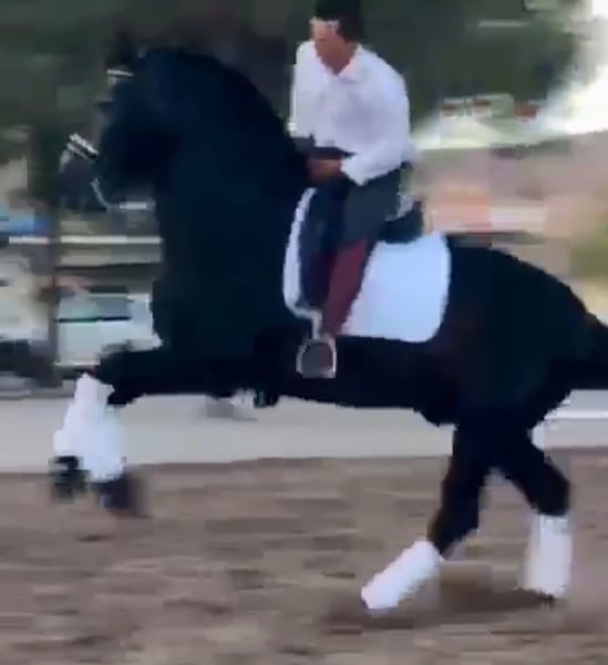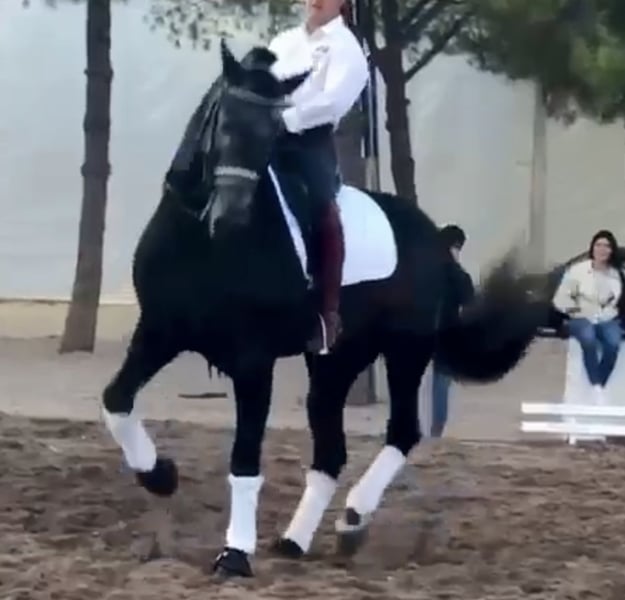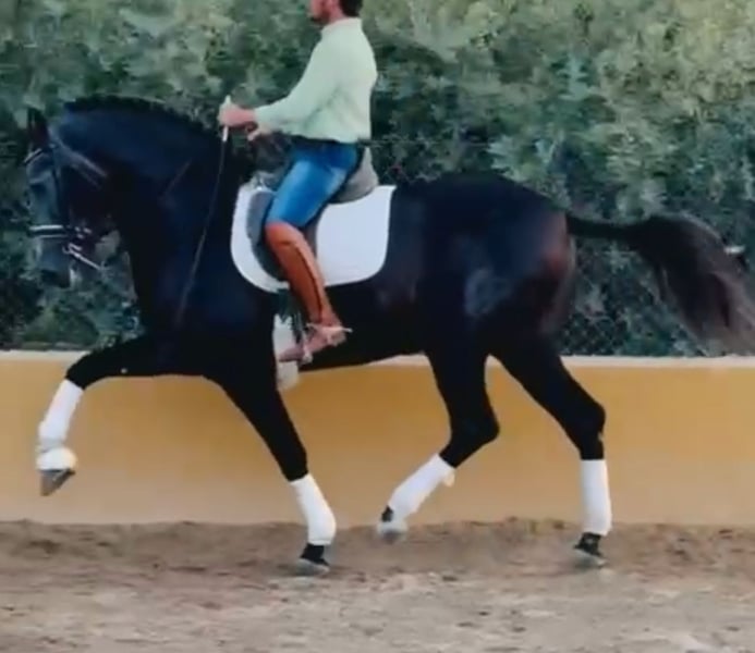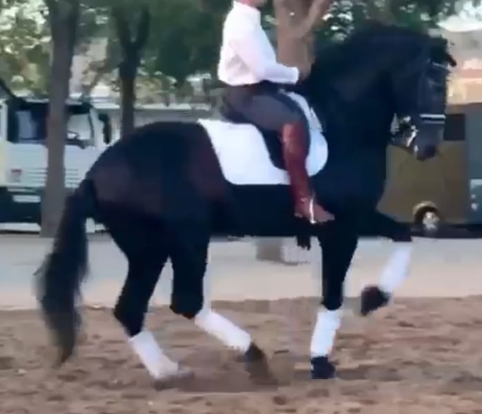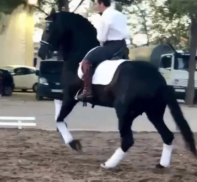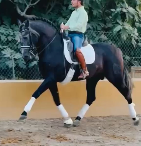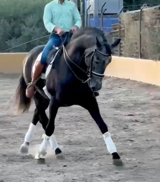 Eyecatching PRE stallion with a magnificent appearance and exceptional training in dressage and show jumping. Irup, born in 2020, holds full ANCCE papers as a PRE. He is currently working at an advanced level thanks to his excellent mindset and willingness to work. He is ridden and trained by a professional rider who is preparing him for higher levels. He has competition experience in functionality classes at ANCCE shows, as well as in morphology and spectacle events, with audiences of thousands. He is piroplasmosis-free and has up-to-date, clean X-rays.