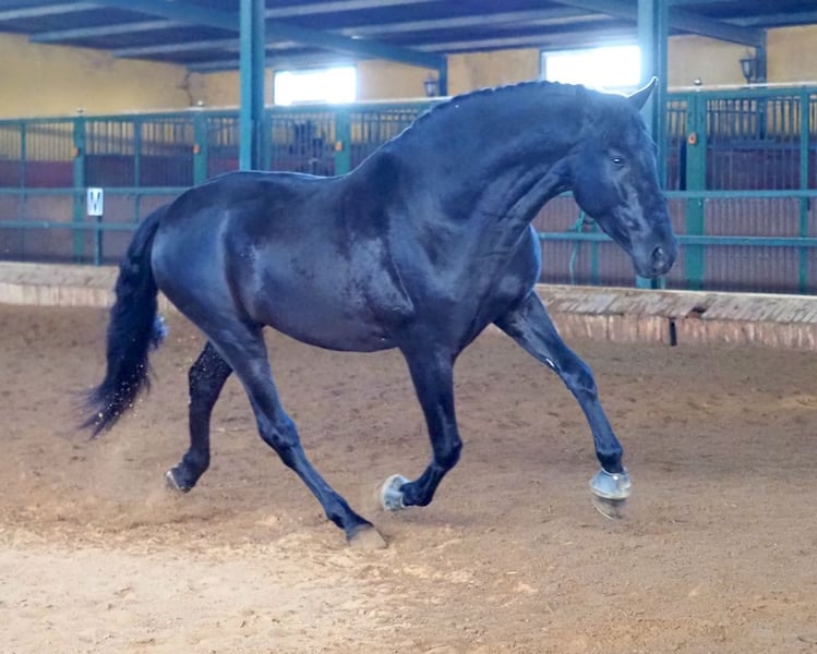 We share with you this fantastic clean black horse, of baroque morphology, and whose elegance and magnetism is present wherever he is. With three correct and balanced gaits, moving with energy and always forward, this young baroque stallion has an exceptional character and an impressive bone structure. Mounted at basic level, he is cooperative with the rider and eager to learn, so his development is quite fast and he progresses quickly. Possibly free of piro due to the area where he has been bred, although he has not yet been tested for piro.