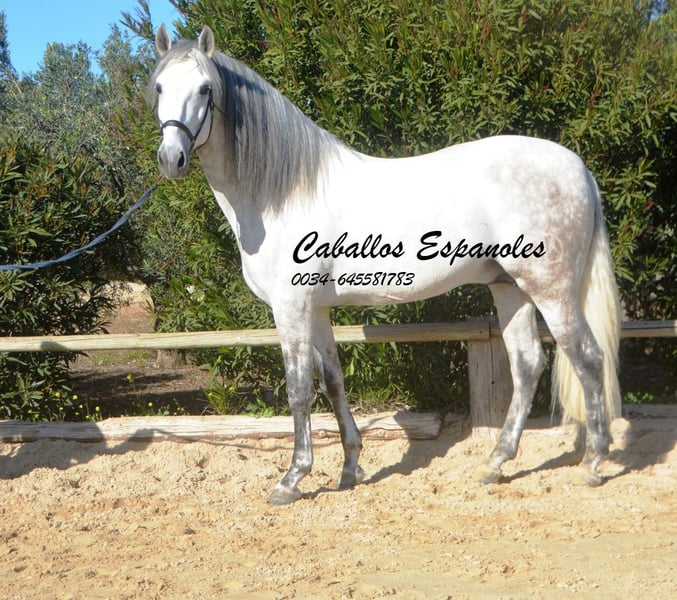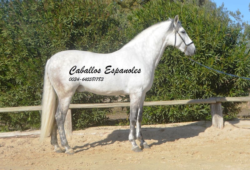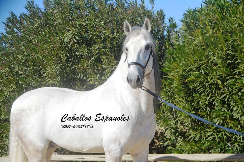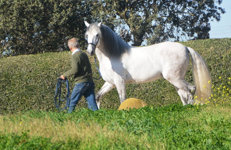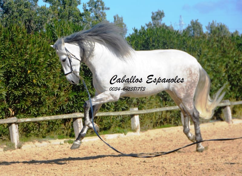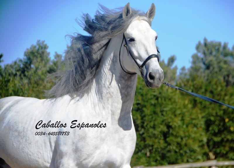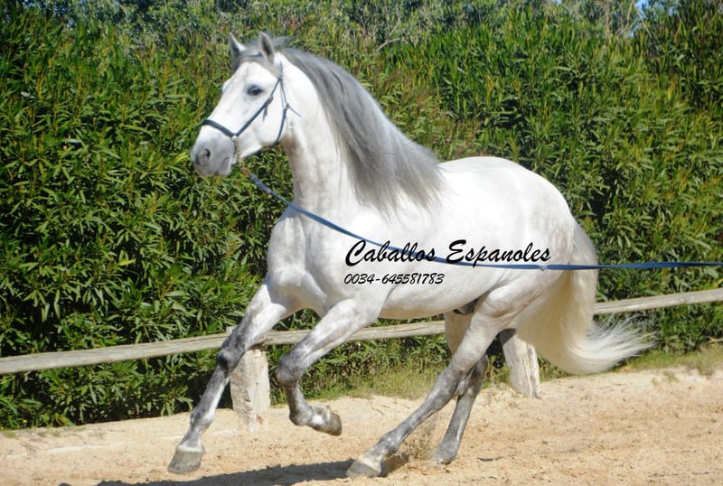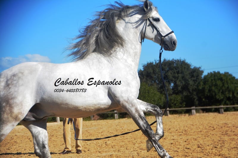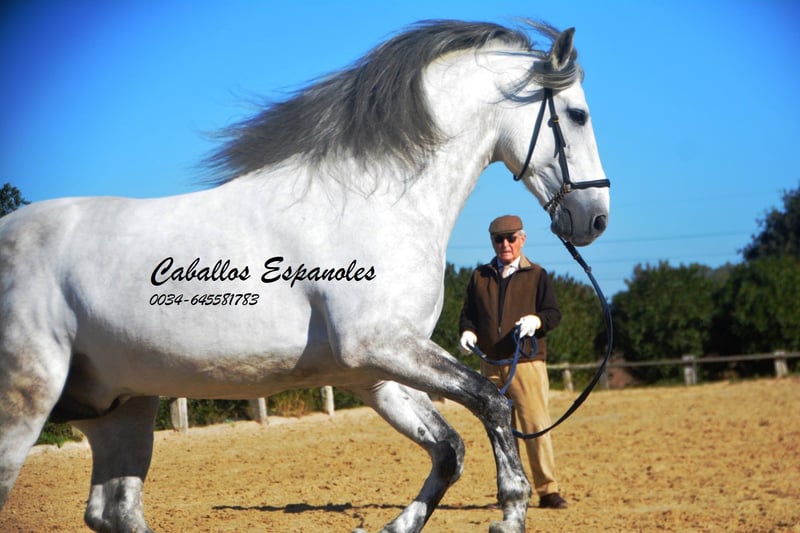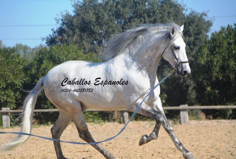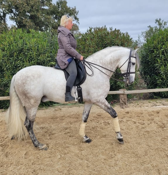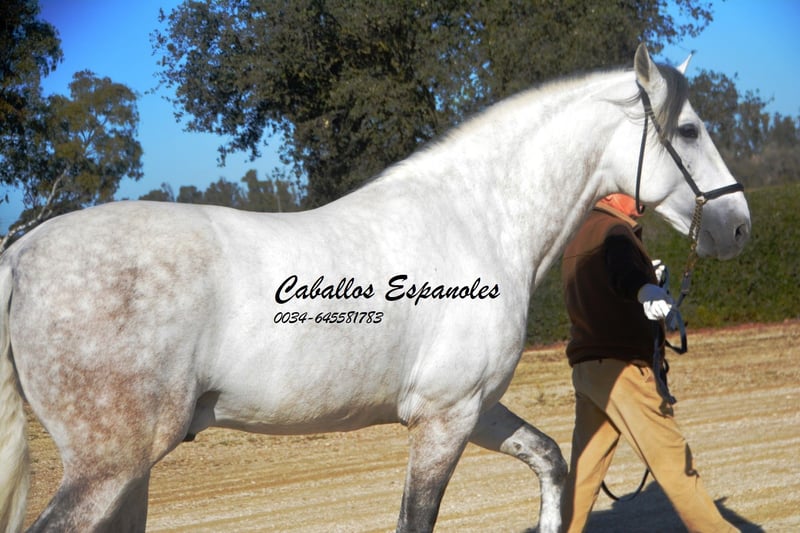 Deze klassieke schoonheid betovert met zijn barokke, elegante verschijning - de Spanjaard zoals hij vroeger was. De hengst heeft een zeer gelijkmatig karakter, super braaf bij het klaarkomen. Hij let niet op de jonge hengsten die in de wei spelen. De schimmelhengst heeft drie goede basisgangen en zit heel comfortabel. Hij is gereden in de basisgangen, zijgangen en we werken aan de vliegende wissels. Hij laat zijn eerste stappen in de piaffe al zien. Het paard wordt verkocht in opdracht Hij is welkom om bij ons in training te blijven. Een AKU wordt op korte termijn georganiseerd. Internationaal transport.