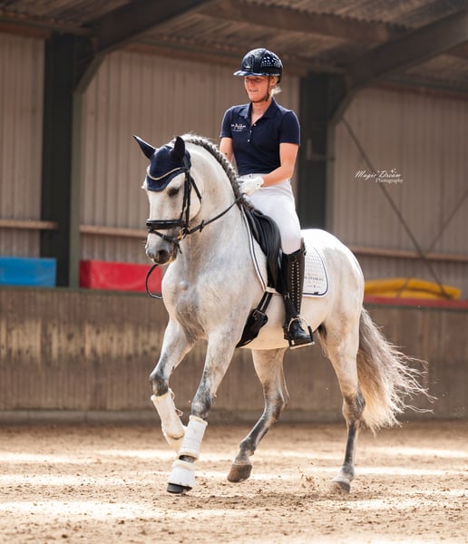 Elias Torreluna is a beautiful grey stallion with a golden character. Elias is a horse that steals your heart right away with his hugs, his beautiful long mane and his beautiful silver glow. He has 3 very good gaits. He possesses a good walk, a great trot with very good hind leg and an uphill canter that is easy to close, he super nice to ride and really gives you a wow feeling. Elias is a suitable horse for both an ambitious rider but certainly also for a novice rider. Elias is classified Z2 and is trained at ZZ light level, he has a lot of talent for passage piaf. Amzone is 1.78. NL Stables Elias Torreluna has already achieved many nice results with his young age. During the Dutch Championships MCI young horses 2023 he became reserve champion with an average score of 86%. Also, this PRE stallion did good business at the European Championships in Paris, he managed to win the first class in the young horses and achieved an overall bronze medal in this class. In the selection trail for the MCI 2024 European Championships, Elias became Dutch champion with a score of 73% in the test and 77% in the Freestyle Level 2. This qualifies him again for the EC MCI 2024 in Exloo. Here he earned the title European Reserve Champion Sevilla and won team gold again for the second time in a row in addition to individual silver. Besides his achievements in the ring at the MCI, Elias is also doing good business at the KNHS competitions. He has several wins to his name among the warmbloods in Z1 with scores around 68% and in Z2 with scores around 67%. Elias finished fourth in Z2 at the KNHS indoor championships 2025. Elias comes directly from the breeder Yeguada Torreluna, fully approved including neck and back.