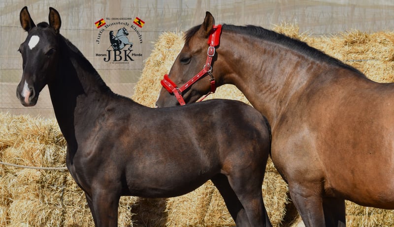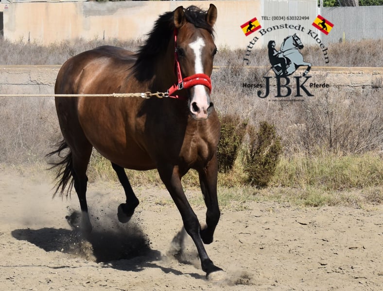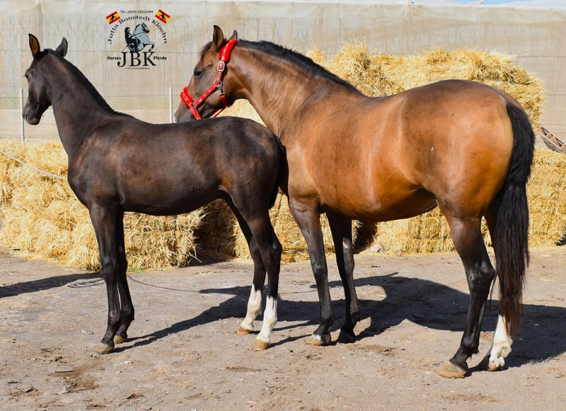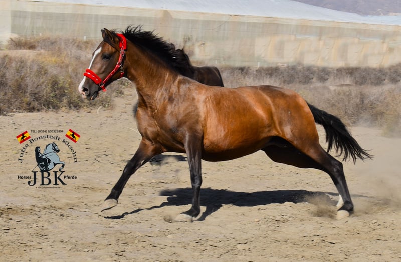 This charming Plaza de Armas mare was born on March 7, 2013. Her activities have so far been exclusively in breeding. Her movements are very expressive with a lot of go. Her character is absolutely delightful. She is very well socialized, gets along excellently in a herd, and she is an excellent mother. So far, she has given birth to 5 foals for the Hispano-Arab breeding, in which she serves as a broodmare. She has never been ridden, but she is familiar with saddle placement and lunging. Her height is 1.60 m.
