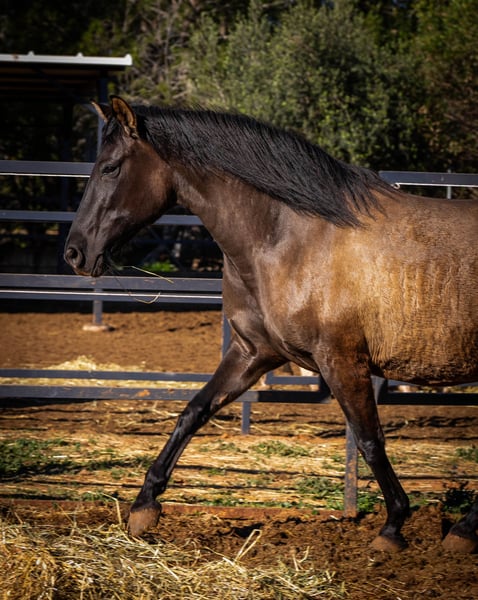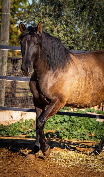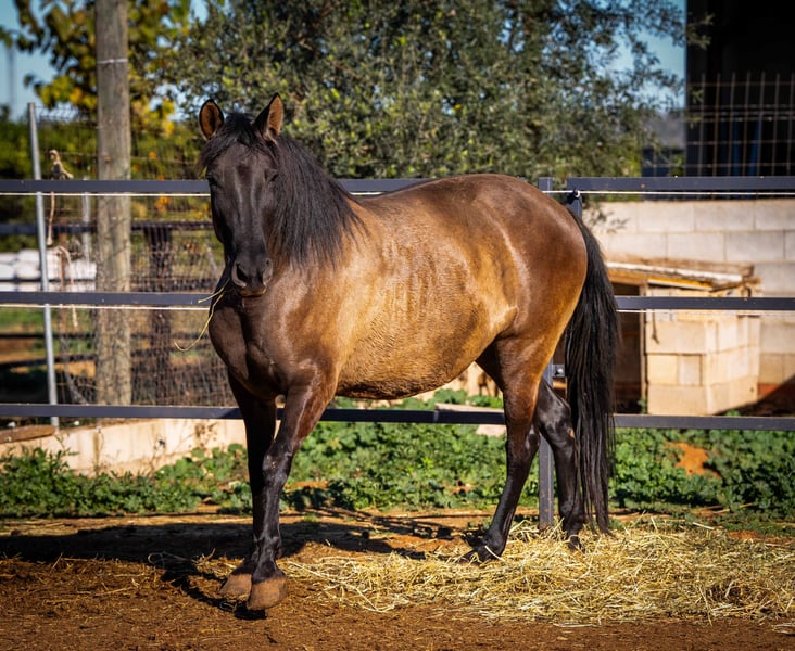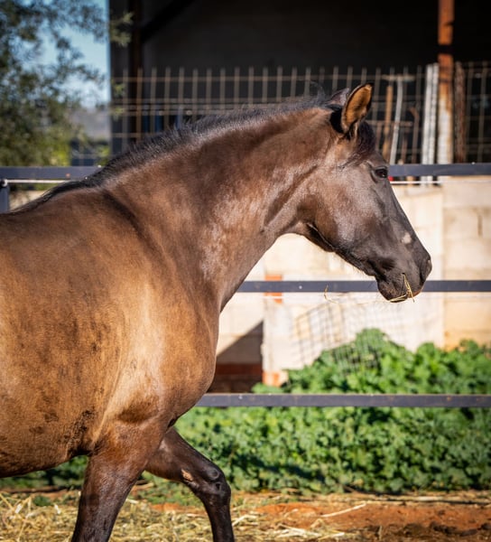 The beautiful PRE mare Festiva enchants with her rare color Smokey Black (Dun) and stands in the stallion type. With her harmonious size and elegant charisma, she is an absolute eye-catcher. Festiva is a true lady of the heart - she loves to be cuddled extensively and is a friendly and confident leader in our small group of three. Another highlight: Festiva is expecting her first foal! The sire is an impressive Isabelo stallion and the birth of this little miracle is expected in March/April 2025 (ultrasound confirmed). We are already full of anticipation for this promising young horse. The mare can also be purchased individually after weaning. Festiva is fed a very natural and varied diet: alfalfa, green oats, fresh twigs, carefully selected herbs and high-quality minerals ensure an optimal supply. She is familiar with both electric and metal fences and lives with her stable mates in an open stable - an environment in which she is very social and relaxed. If you would like to know more about Festiva or see more pictures (including the stallion), please write me a PN!