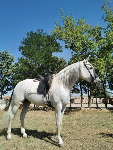 Aroa Purebred Spanish mare with registration papers Measured height with a hipometer: 1.50 m (15.0 hands). Large size Torda (spotted coat) Born in 2009 Ideal for both competition and leisure riding Has participated in numerous events of all kinds (competitions, shows, pilgrimages, fairs) Good movements Very well-trained and with a great rideability Leg yielding, shoulder-in, travers, renvers, steps... For any inquiries, please call 696613777