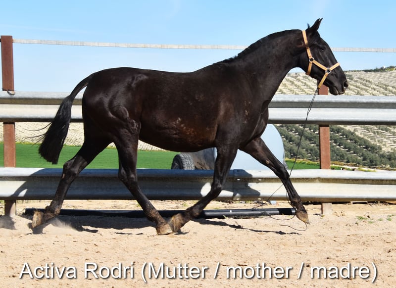 łagodny charakter, nieokiełznana, przebywa z matką oraz innymi klaczami i źrebiętami na zewnątrz, duża, dobre ruchy, specjalny kolor, czarny z genem kremowym, pochodzenie: Juan Antonio Fernandez Vargas, Yeguada Jose Luis Rodriguez Ramirez, Escalera, pradziadek Dominante XVI jest kwalifikowany www.elegante-andalusier.com