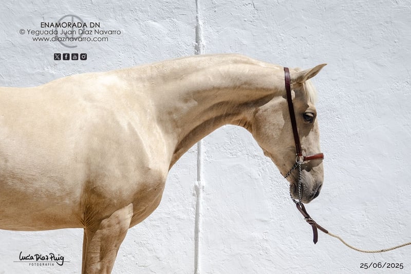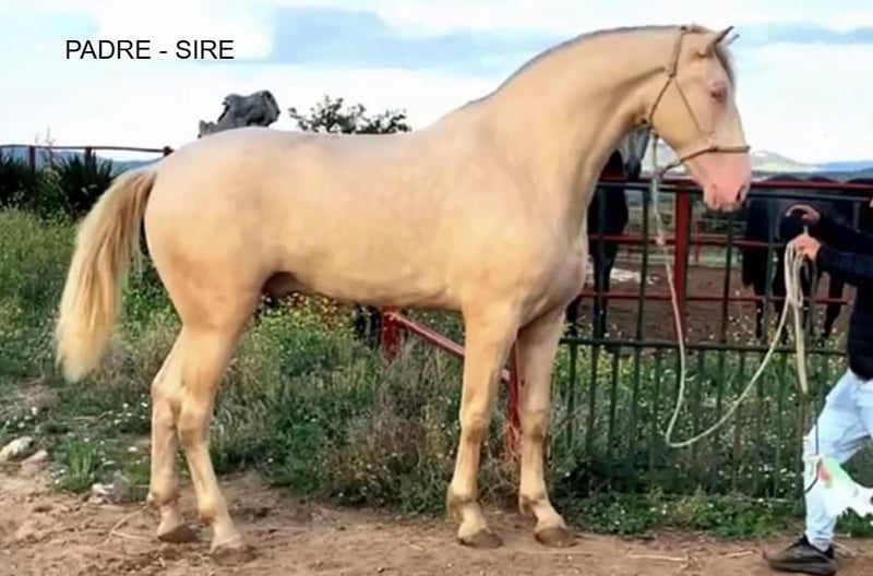 Opportunity to acquire a beautiful and promising mare! For sale is a stunning PRE mare born in 2024. She is palomino in color, with a shiny, eye-catching coat. Her height is 156 cm, making her suitable for various disciplines and equestrian activities. This mare comes from excellent bloodlines, ensuring quality and potential for future competitions or breeding purposes. She has a balanced temperament, suitable for both experienced riders and those new to the world of horses. Genetic coat color (genotype): ggAaeeCCrNN Height: 1.56 m at the withers (June 25, 2025) Comments: A mare with great potential, capable of producing offspring of all coat colors except for the isabellas. Lineage: Divo, Norte A, Cepellón, Velero XI, Lego, Lebrijano III, Bizarro XIV, Llamativo II. Military Stud, Vizconde de la Montesina, D. Benito Zoido, Paco Martí. Don’t miss the opportunity to add a high-quality, beautiful mare to your family or estate. For more information and inquiries, please do not hesitate to contact us.
