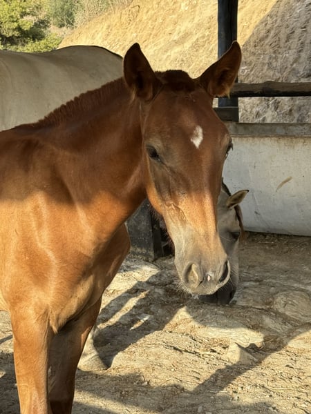 Our Undine combines the qualities of her multiple award-winning PRE sire with her purebred Lusitano dam. The last photo shows the sire. Undine is expected to grow to around 16.1 hh, so she is currently a bit unbalanced, which is typical for her second year of life when growth spurts occur. She is well-suited for collected movements, haute école, Doma Vaquera, and similar disciplines. She has inherited the gentle temperament of her mother. Since I have built my breeding program in Spain, Undine can be visited in Malaga.