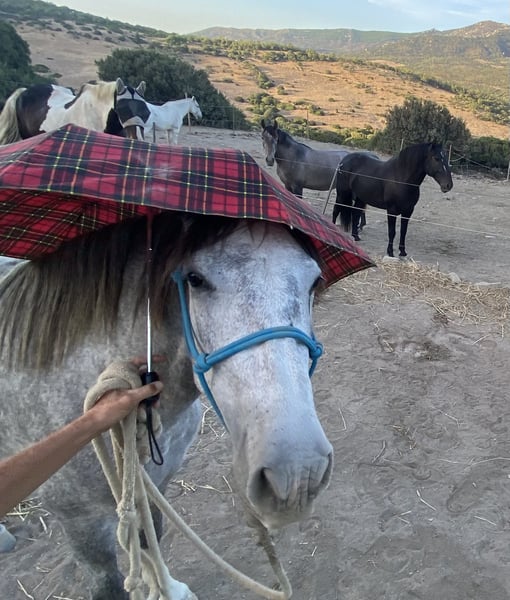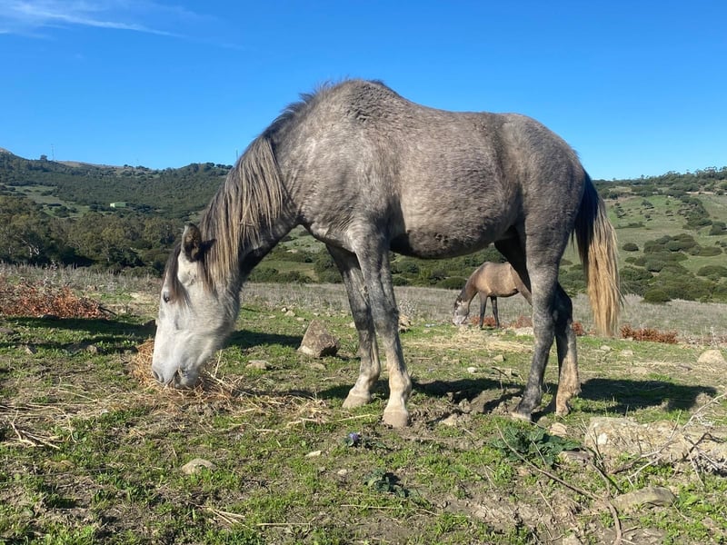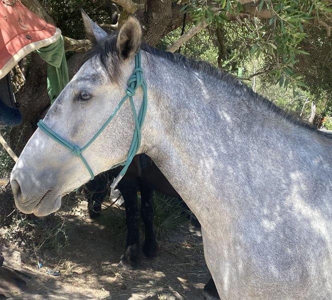 Esta hermosa y muy cariñosa yegua PRE está en venta, ya que voy a quedar demasiado pesado para ella. Lamentablemente, porque es una yegua robusta, pequeña, compacta y de tipo baroque, que aprende muy, muy rápido y será la mejor amiga de alguien, ya que es muy afectuosa y necesita cariño. Cumplirá tres años en marzo. Después de solo dos paseos, ya confiaba plenamente en mí, y tras dos sesiones de manejo con cuerda, ya pude trabajar con ella en libertad. Seguimiento libre, trotar hacia mí, y trotar y caminar en círculo sin cuerda. Todo muy dócil y amigable. También se puede tocar en cualquier parte y no hay problema con el cuidado de los cascos. El galope es con rebote. Es adecuada para jinetes ligeros o niños muy cariñosos. No es apta para reproducción, ya que sufrió un edema en la ubre debido a una garrapata. Actualmente vive con su media hermana y cuatro machos en un paddock de 5 hectáreas con pasto.