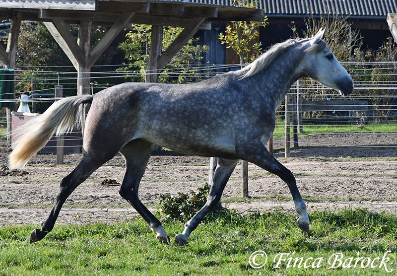 Ras: PRE Naam: Buleria AR IV Geslacht: Merrie Stockmaat: 1,59 m Geboren: 20-09-2022 Kleur: Schimmel Prijs: € 9.800 Vader: Zurito MIBXBII v. Algabeño MIBXII Moeder: Dakota CB v. Quebrado HBM II Buleria is een ontzettend lieve, lange en elegante merrie met een vriendelijk karakter. Ze kent het longeren met de cavessons, zowel met zadel als bit. Ze is licht aanrijbaar in de grondwerk- en gangenarbeid en toont zich als een echte leermeester. Haar zitcomfortabele bewegingen zijn bijzonder opvallend. Ze is nieuwsgierig en open, geniet van nieuwe taken en werkt altijd zelfverzekerd mee. Bij geluiden op de manege (tractor, kar, helikopter op het naburige veld) blijft ze rustig in haar paddockbox en kijkt aandachtig om zich heen. Ze lijkt te denken: "Hier gebeurt veel, dat wil ik zeker bekijken!" Buleria is bekend met gemengde groepshoudingen. Tijdens korte wandelingetjes rondom de manege toont ze zich weinig schrikachtig en eerder nieuwsgierig naar onbekende dingen. Met haar krijgt u een jonge dame die al goede basisvaardigheden heeft, maar nog alle opties openhoudt voor verdere training. Inclusief klinisch dierenartsonderzoek en röntgenfoto’s. Contact: Finca Barock, Tel. 0173-696 31 81, 56291 Wiebelsheim